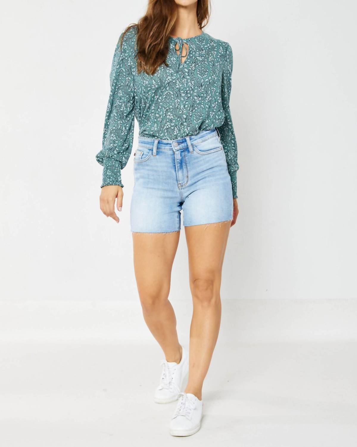 Jean shorts so versatile, you can literally wear them with anything. Introducing the Light Wash High Waist Shorts by Judy Blue, a staple piece in light blue that brings effortless style to any outfit. These women's jean shorts feature a flattering high waist with a cut-off design, available in regular and plus sizes. Composition: 93% Cotton, 5% Polyester, 2% Spandex. Closure: Button closure. Regular sizes have a front rise of 10.5" and an inseam of 5", while plus sizes boast a front rise of 12.25" and an inseam of 6". Pockets are available for added convenience.