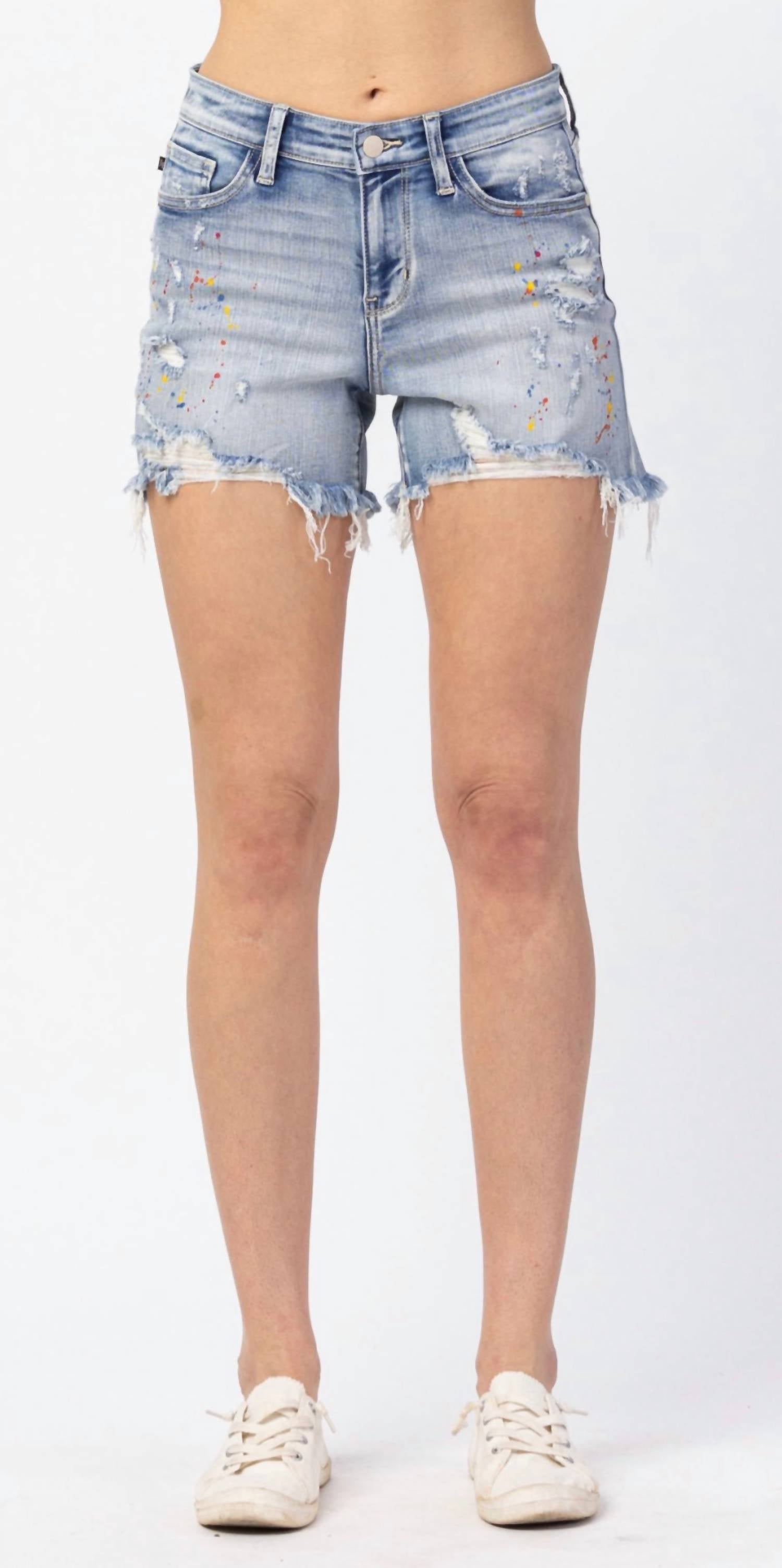 You can never have too many jean shorts and these will be your new favorites. Judy Blue Mid Rise Shorts with rainbow paint splash cutoff short. 92% cotton, 6% polyester, 2% spandex. Rise 10.25". Inseam 4.5".