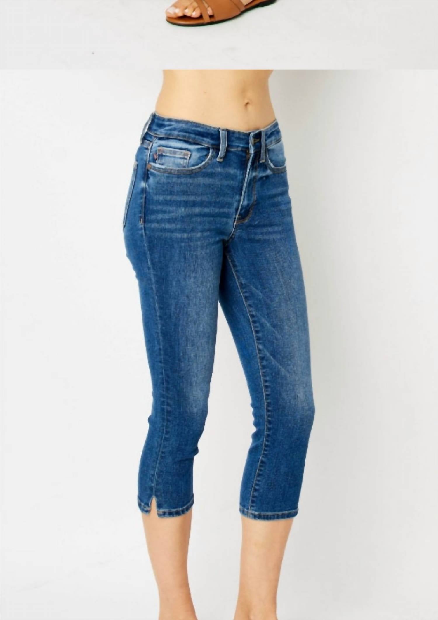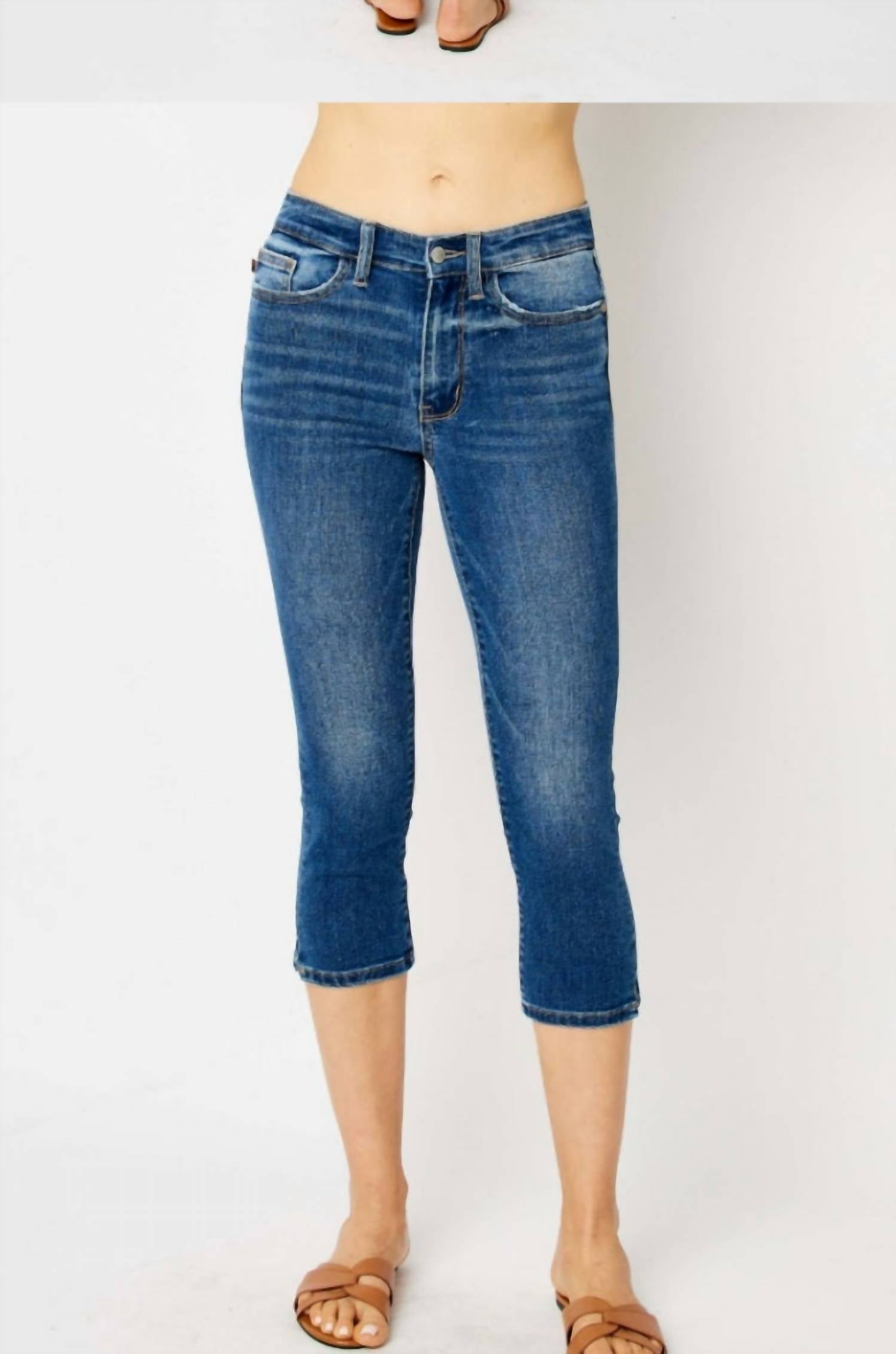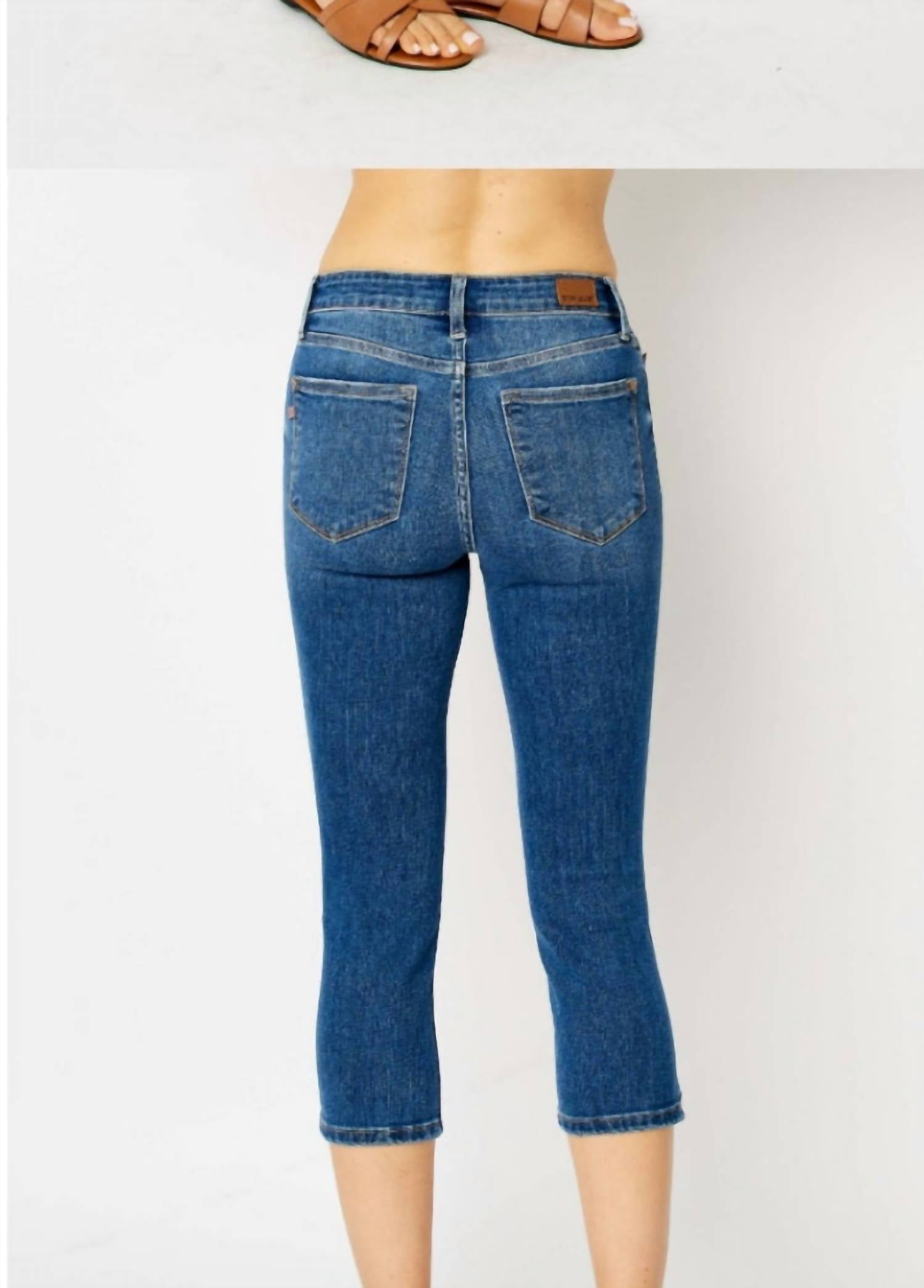 Wear these adorable capri pants with slides or cute flats for an effortlessly cool look. Stay effortlessly chic and comfortable with the Judy Blue Summer Lovin' Midrise Capris, your go-to denim for warm-weather days. Designed with a flattering mid-rise fit and cropped length that hits just below the knee, these capris combine classic style with modern comfort. Finished with a classic five-pocket design. Made from 66% cotton, 21% polyester, 11% rayon, and 2% spandex.