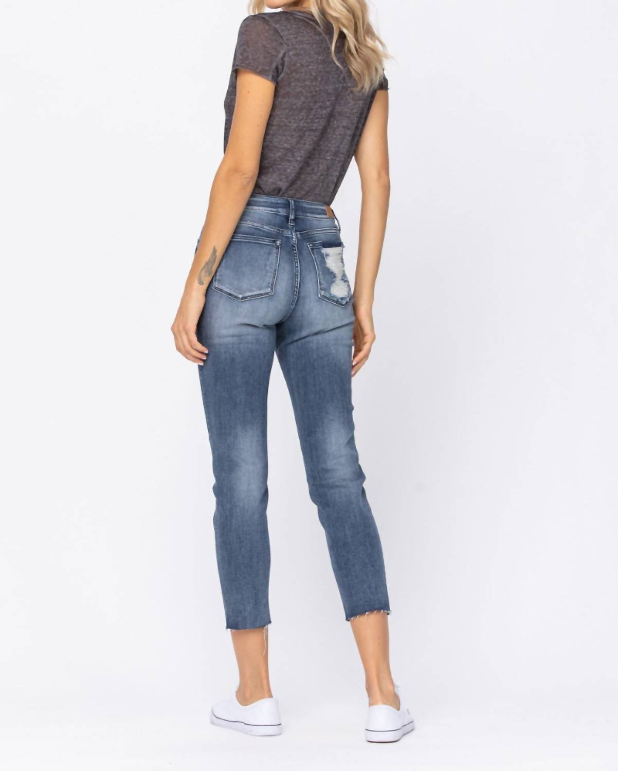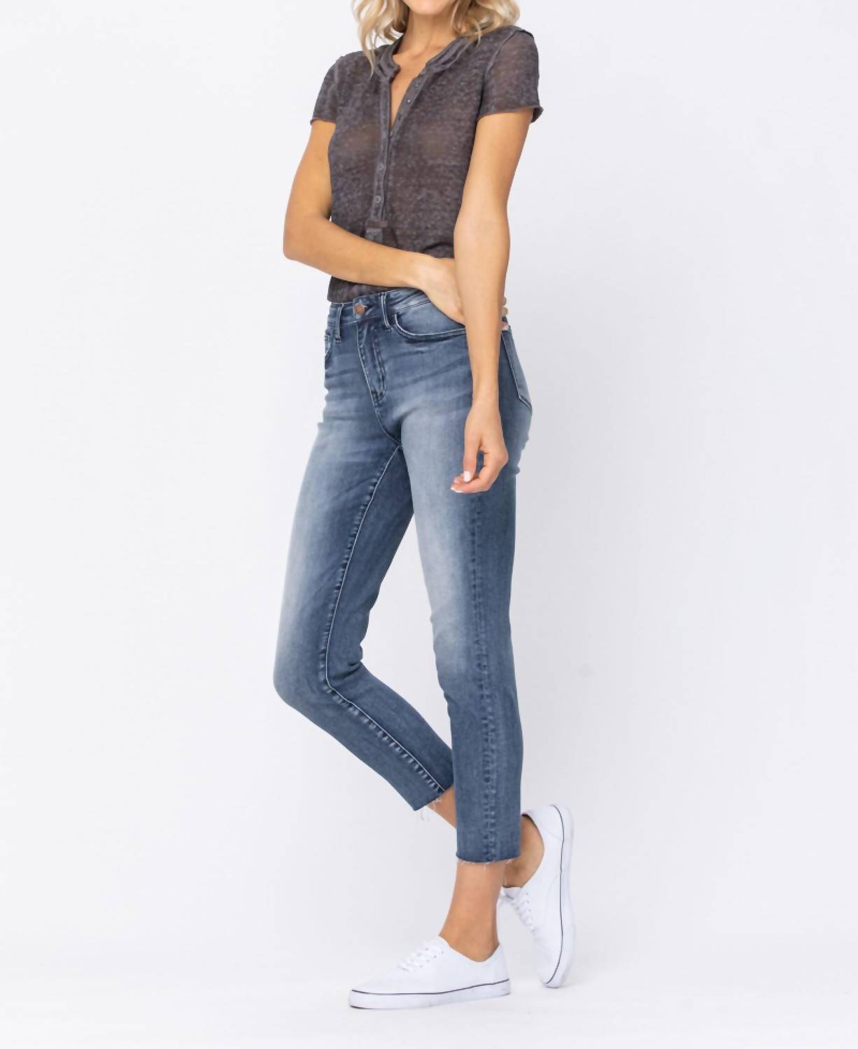 High-waist is here to stay and we especially love this style. Judy Blue raw hem high waist relaxed fit denim . 92% Cotton / 7% Polyester / 1% Spandex. RISE: 10.5". INSEAM: 27". Model Info: Size: Small. Height: 5'9. Waist: 24". Hip: 34".