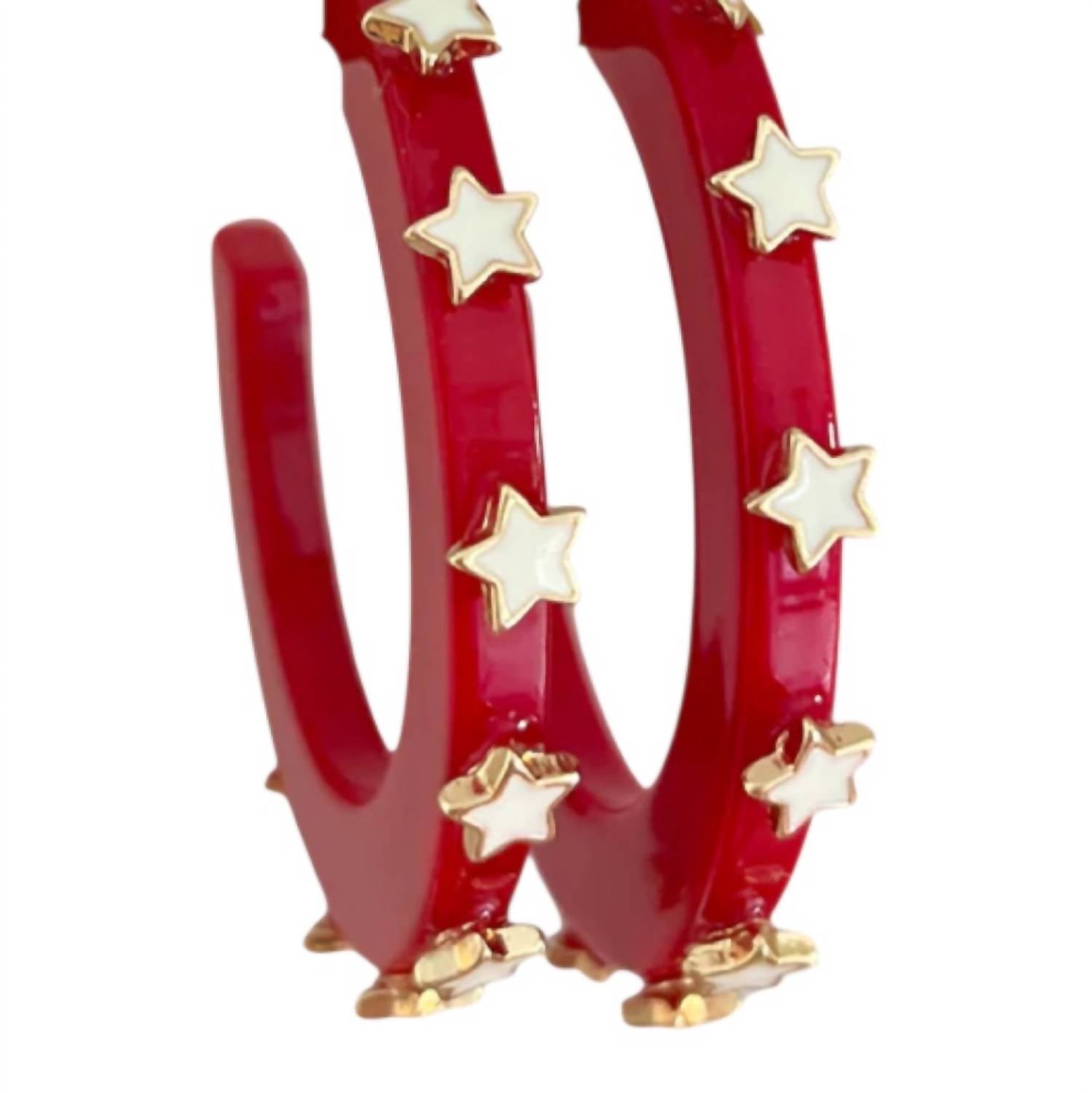 eye-catching earrings for every occasion. Add a touch of sparkle to your ensemble with the Women's Starlight Jewel Hoop Earring by Smith & Co, crafted in North Carolina. These sophisticated acrylic hoops feature eye-catching red with white enamel stars and measure 1 1/4" in diameter for a perfect statement accessory. Equipped with eco-friendly and lead-free steel posts, these earrings are both sustainable and safe for sensitive skin. Ideal for holiday gifting, they offer a blend of fun and elegance.