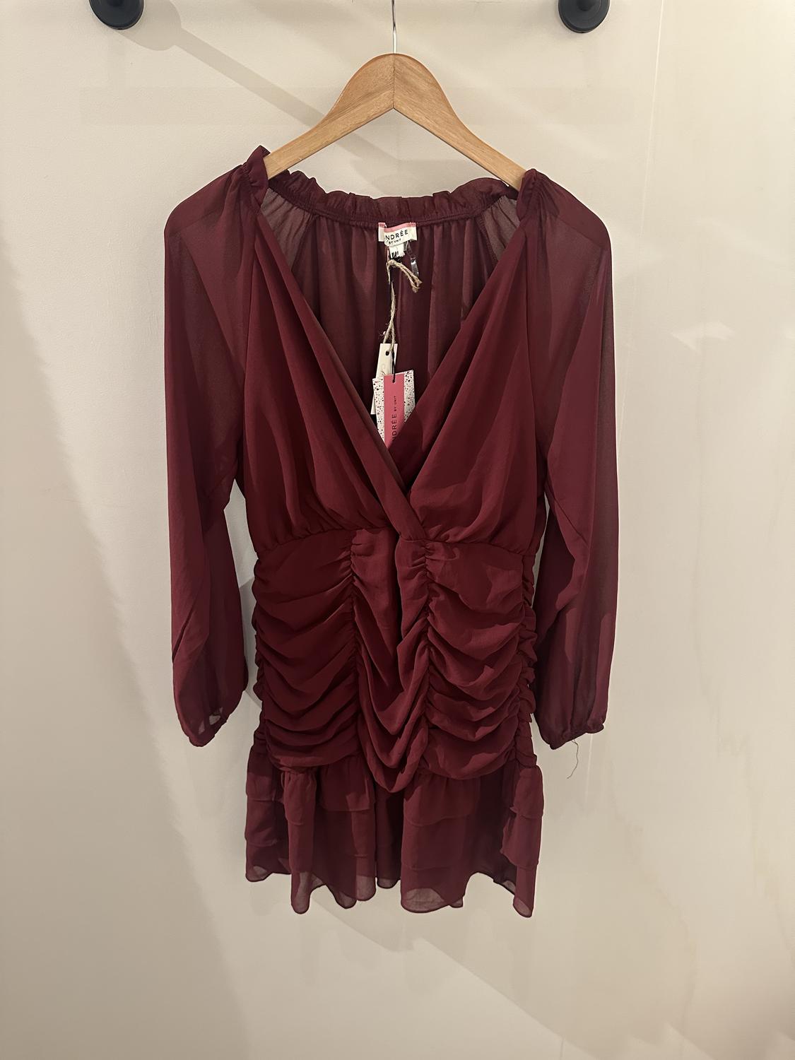 The dress, featuring a V-neck, sheer or chiffon sleeves, and an elasticated or ruched body. The dress features sheer long sleeves, a plunging V-neckline, ruched detailing throughout the body for a body-contouring fit, and a ruffled or mini-length hemline.