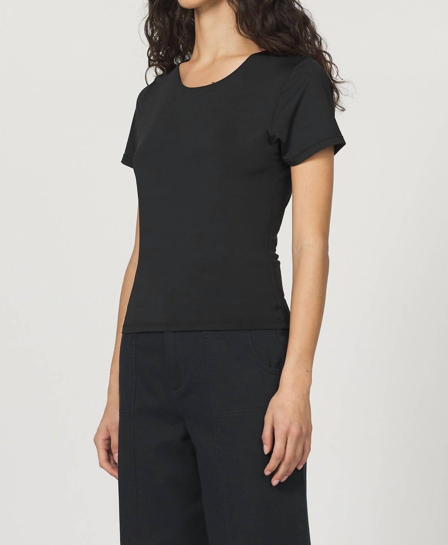Elevate your wardrobe with the Seema Stretch Tee by Another Love, a perfect blend of style and comfort in minimalist black. This short sleeve tee crafted from a 90% Nylon, 10% Spandex blend features a flattering crew neck and a seamless pull-on design. Made with a double-layered construction, it's imported for superior comfort and elegance. Care: Machine wash cold, tumble dry low. Dimensions for size small: Body length from HPS: 22", Sleeve length: 7", Bust: 34".