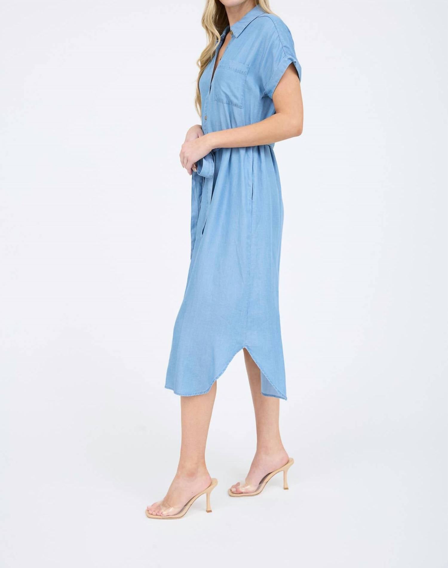 A short and breezy dress for those warmer days. Introducing the Chambray Belted Button Down Midi Shirt Dress by Blu Pepper, perfect for embracing 90s Fashion this Spring. This solid-patterned dress features short batwing sleeves and a collared neckline with a drop shoulder design. Crafted from 100% Lyocell, it showcases a stylish U hem and includes a strap tie belt with belt loops for added flair. Closure: Button closure. Ideal for Thanksgiving or a vacation getaway.