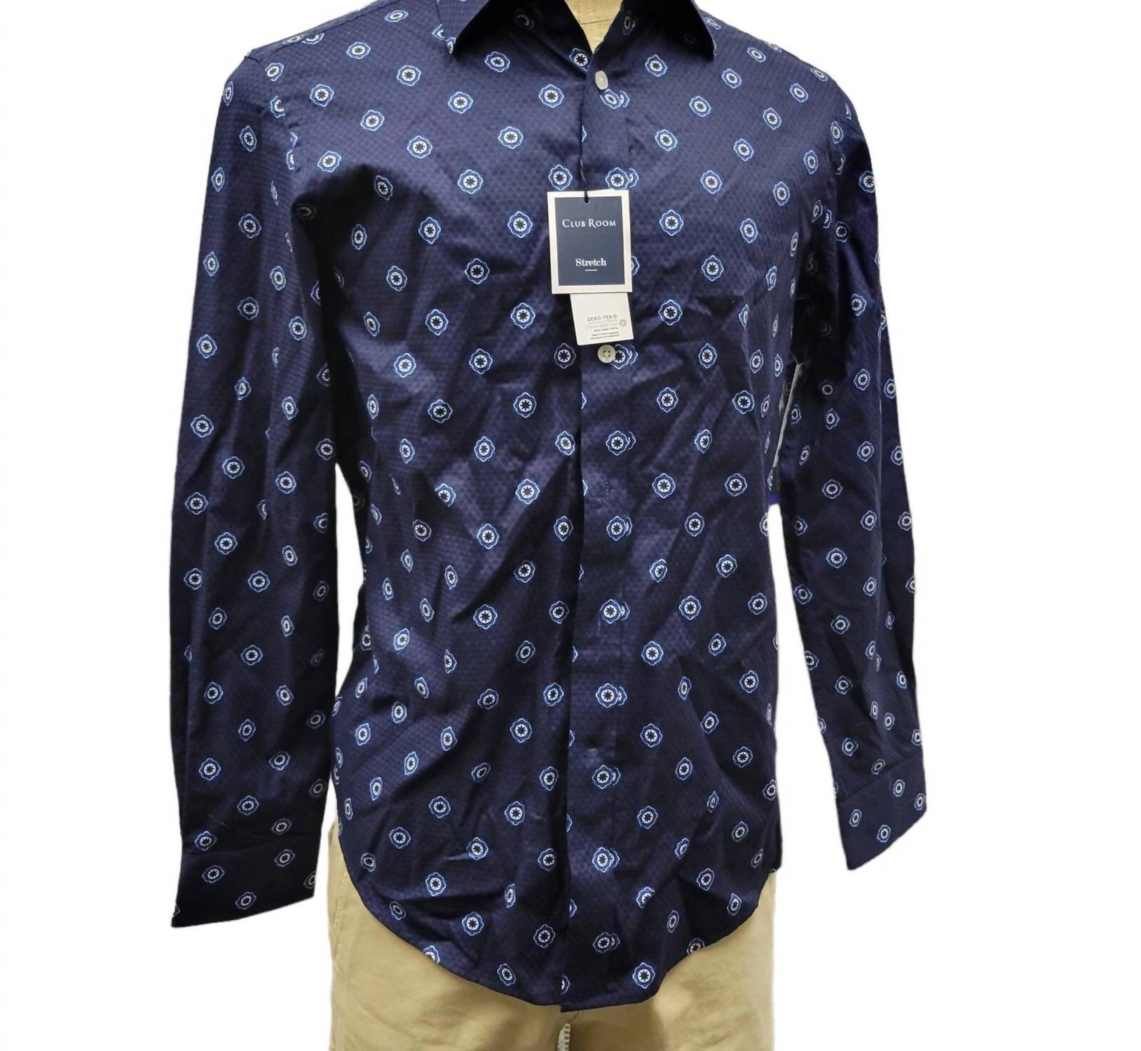 Elevate your workwear wardrobe with the Men's Geometric Print Woven Shirt by Club Room. This regular fit shirt comes in a sophisticated navy color, featuring a spread collar and long sleeves for a polished look. Crafted from 100% cotton, it offers a comfortable stretch fabric with a striking all-over geometric print. Made in Vietnam, this shirt is easy to care for with machine washable instructions and a button closure for effortless style.