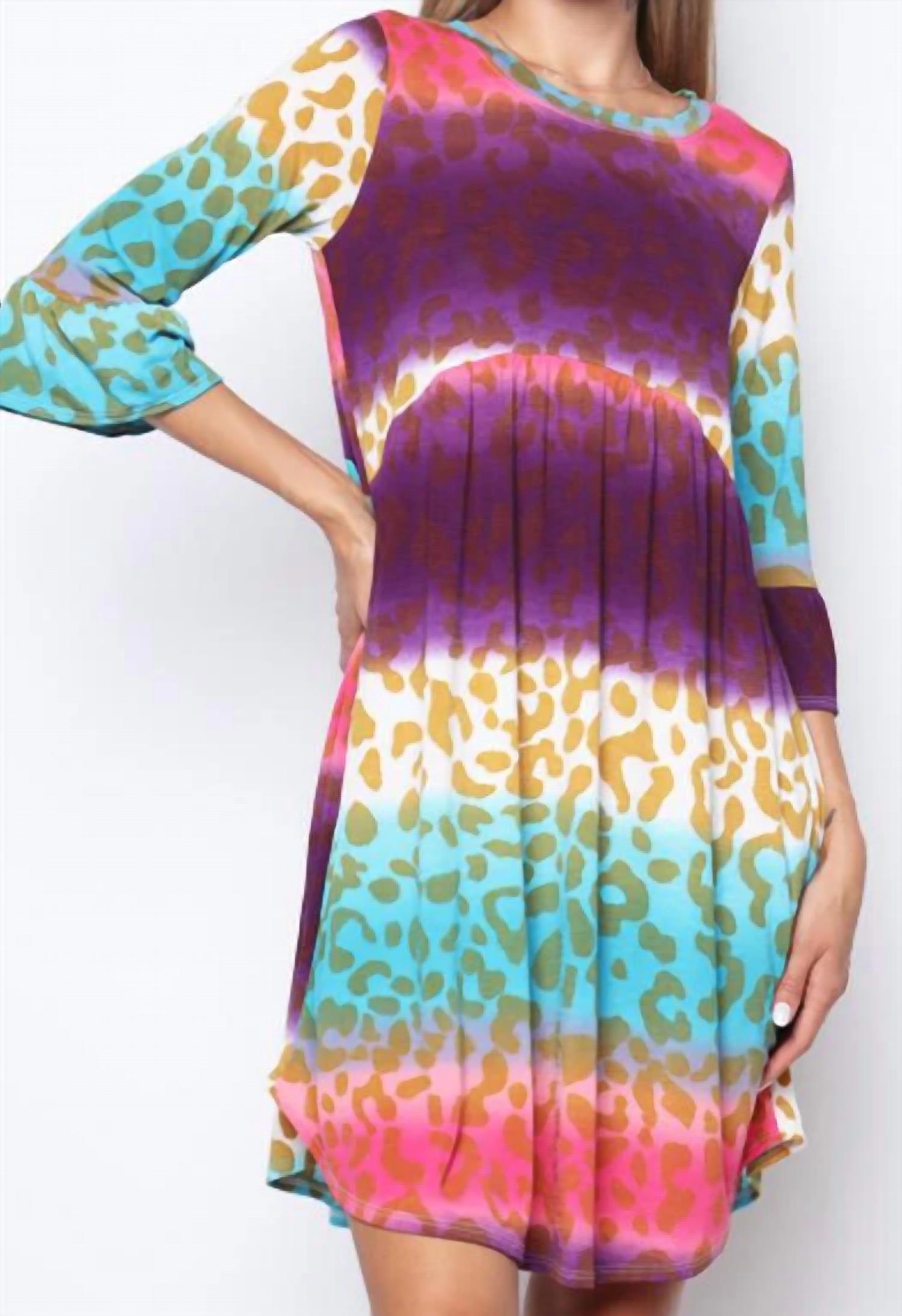 The perfect mini dress for those warmer months. Introducing the Ombre Leopard Dress by Collective Rack, a vibrant and captivating addition to any wardrobe. This mini dress features three-quarter sleeves and an A-line silhouette, with a crewneck design that enhances its chic appeal. Perfect for a spring baby shower, the multicolor ombre and animal print make it stand out. Made for women, this dress is both playful and effortlessly stylish.