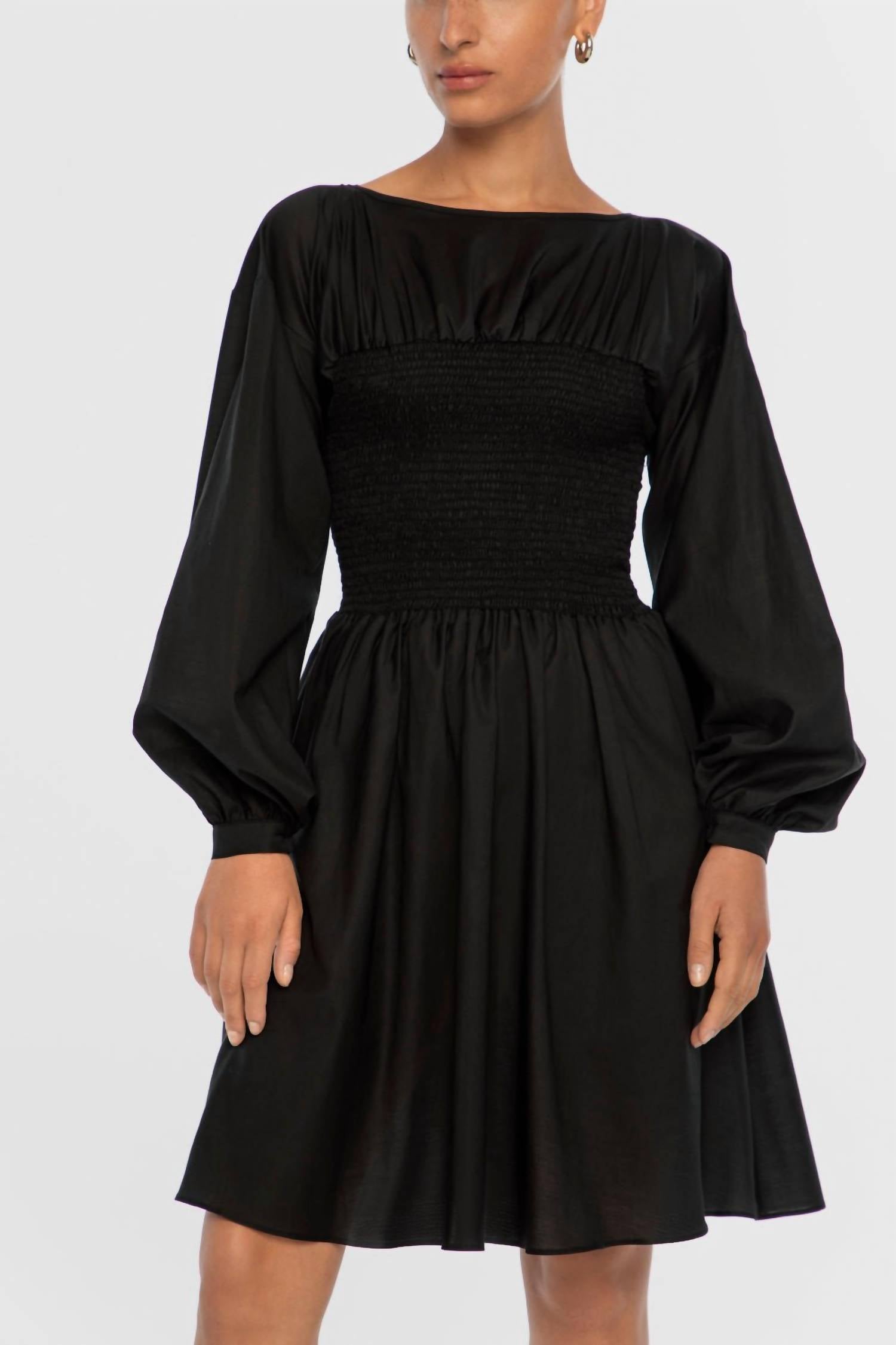A short and breezy dress for those warmer days. The Smocked Dress by Dāl the Label embodies a romantic spirit with its elegant design. This minimalist black dress features long puff sleeves with buttoned cuffs and a flattering boat neckline. Crafted from a luxurious cotton blend, it boasts a textured pattern and a smocked elastic bodice, finishing in a flared skirt that hits just above the knee. Ideal for spring evening events, this fit-and-flare silhouette requires dry cleaning for optimal care. Closure: Pull-on design.