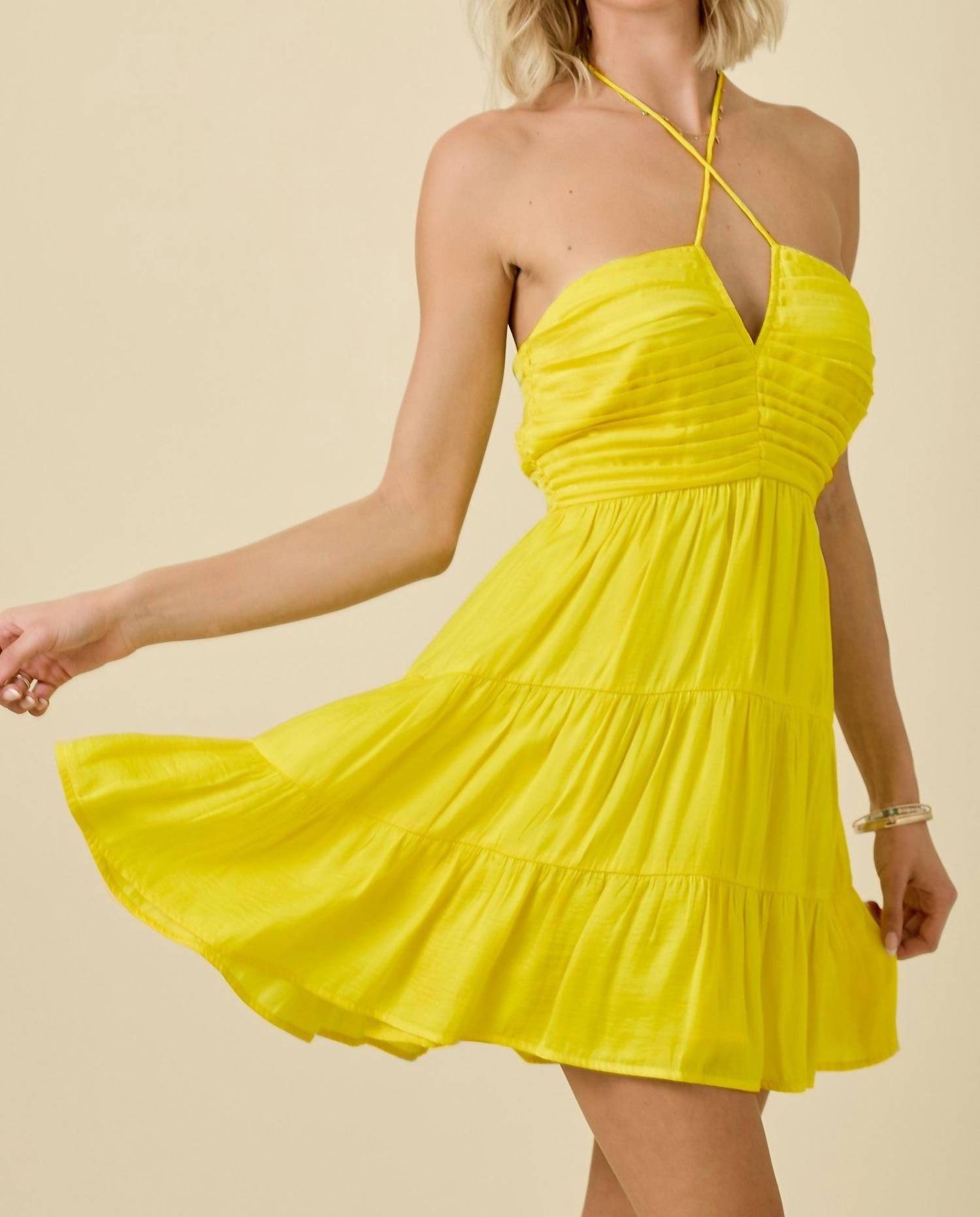 The kind of easy and flattering dress you'll be reaching for all season long. Elevate your summer wardrobe with the Day + Moon Veronica Ruched Tiered Mini Dress in a vibrant lemon yellow. Featuring elegant spaghetti straps and a flirty halter neckline, this A-line mini dress boasts playful ruching and a tiered skirt that are perfect for vacation nights. Crafted from 100% polyester with a 97% polyester and 3% spandex lining, this solid pattern piece provides a form-fitting silhouette that exudes confidence and style. Closure: Zip. Care: Hand wash cold.