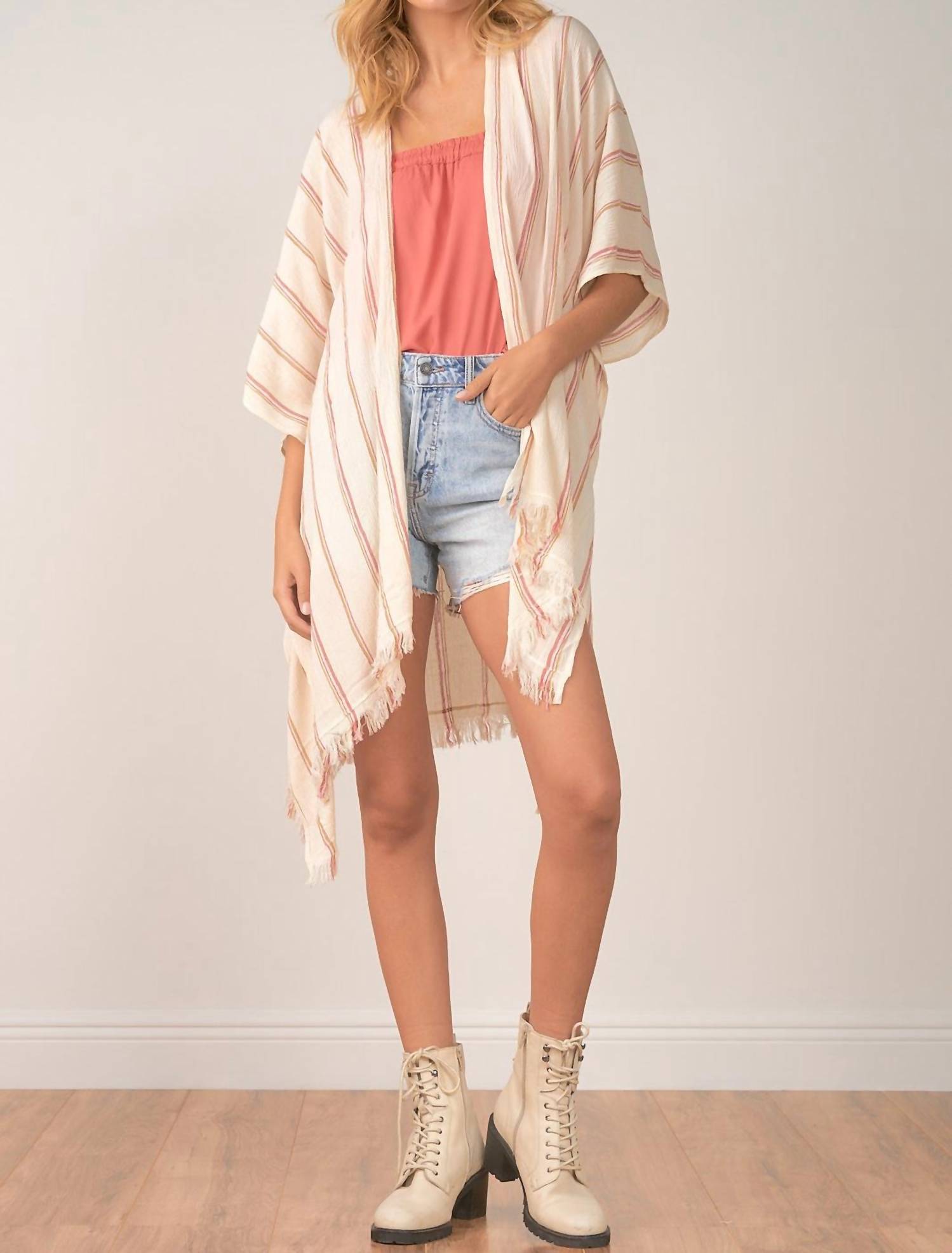 This cardigan will be a sweater-rotation favorite. Introducing the Riley Kimono by ELAN, a must-have layer for your wardrobe in an elegant natural stripe design. This cardigan features a V-neck and three-quarter sleeves, perfect for adding a touch of Boho Chic to your fall ensembles. Ideal for travel, it effortlessly complements your favorite denim or serves as a chic swim cover-up. Care is simple with hand wash instructions, ensuring longevity and style retention.