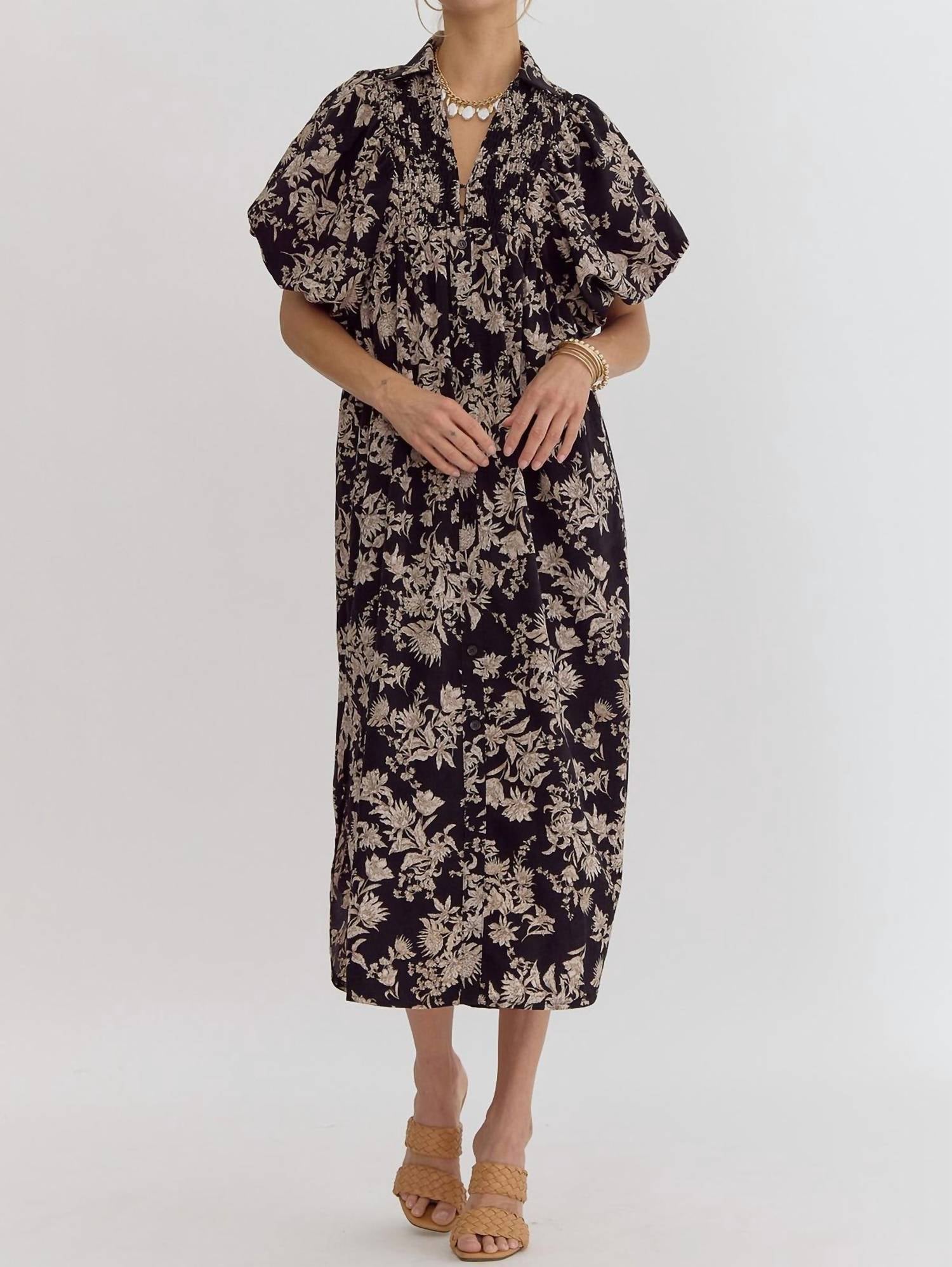 Who doesn't love a good maxi dress? This one you'll be reaching for season after season. Introducing the Raquel Maxi Dress by Entro, a chic addition to your fall wardrobe in Black with a delicate beige floral pattern. This dress features short oversized puff sleeves, a classic collar, and a v-neckline enhanced by hook-and-eye closures. Crafted from 100% Polyester, it includes smocking detail on the chest for a flattering fit and a button-down skirt for a charming finish. Designed without pockets, it is ideal for Thanksgiving gatherings and dinner parties, embodying a 90s fashion resurgence perfect for the autumn season.