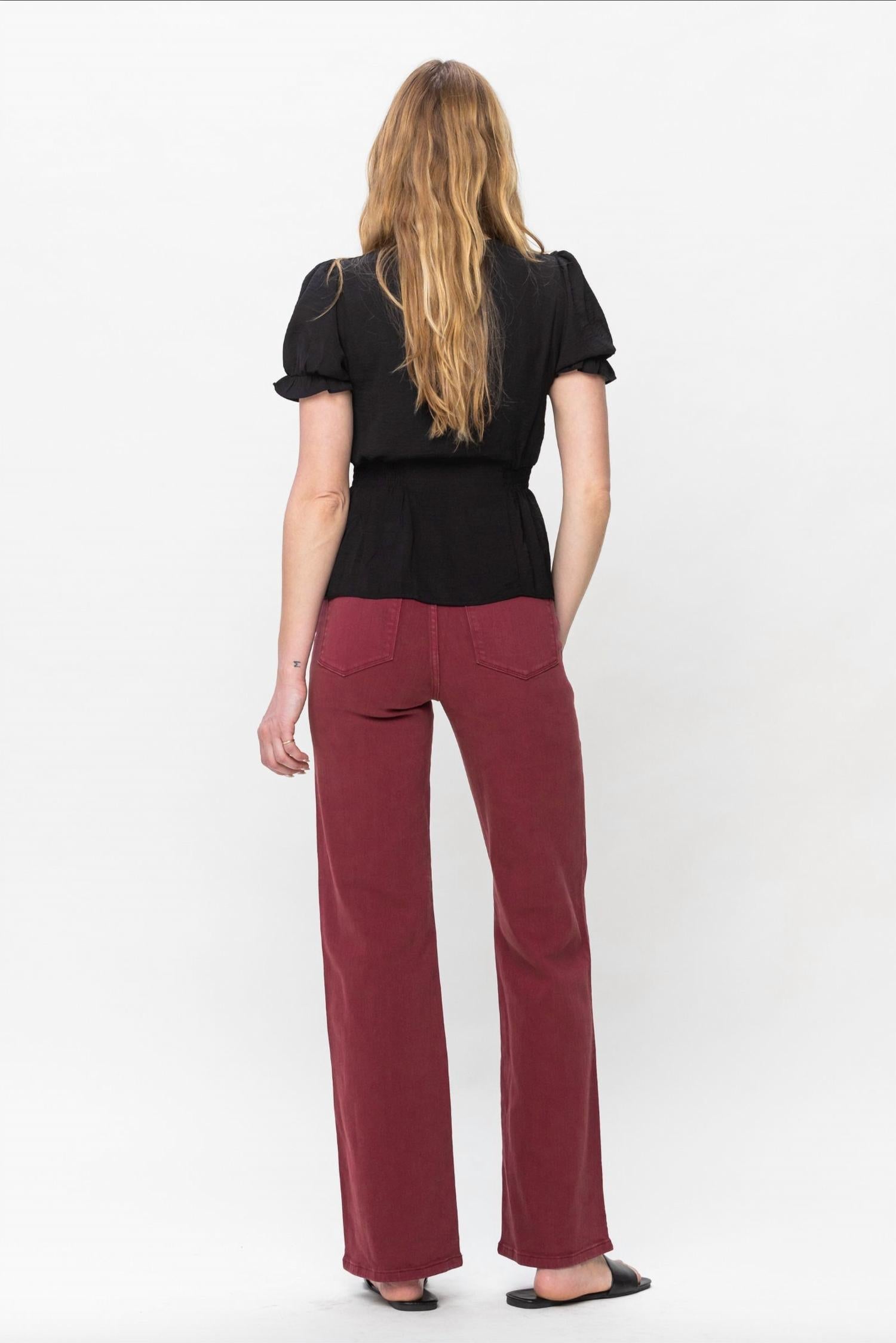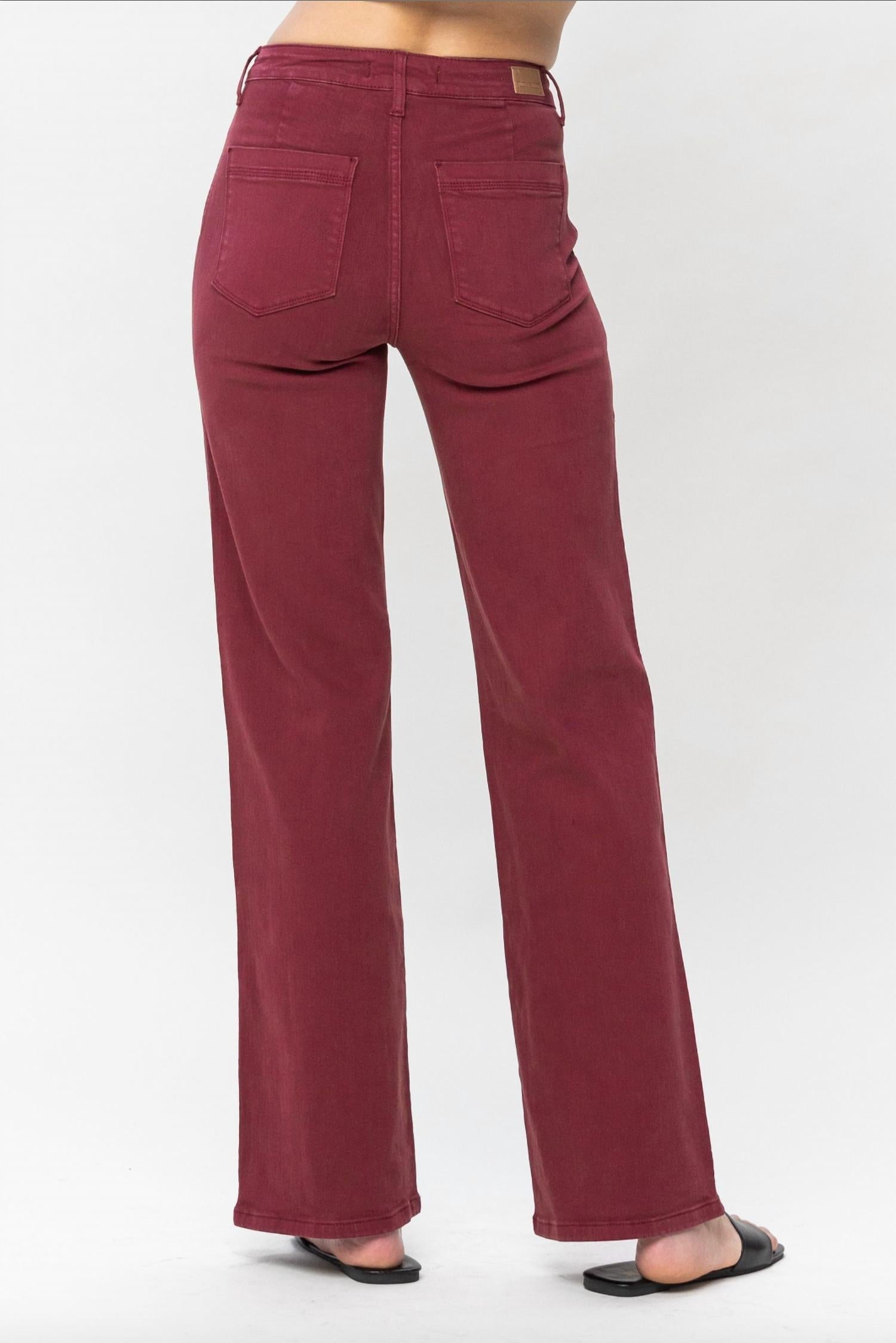 This classic straight leg jean has a perfect fit and goes with just about everything. Introducing the Judy Blue Front Seam Jeans, a sophisticated choice for your wardrobe in a rich burgundy hue. Crafted from a comfortable cotton blend with 93% cotton, 6% polyester, and 1% spandex, these jeans feature a high-rise waist with a 10.75" rise and a sleek zip closure. The straight-leg style offers a flattering silhouette with a 32" inseam. Designed for versatility and style.