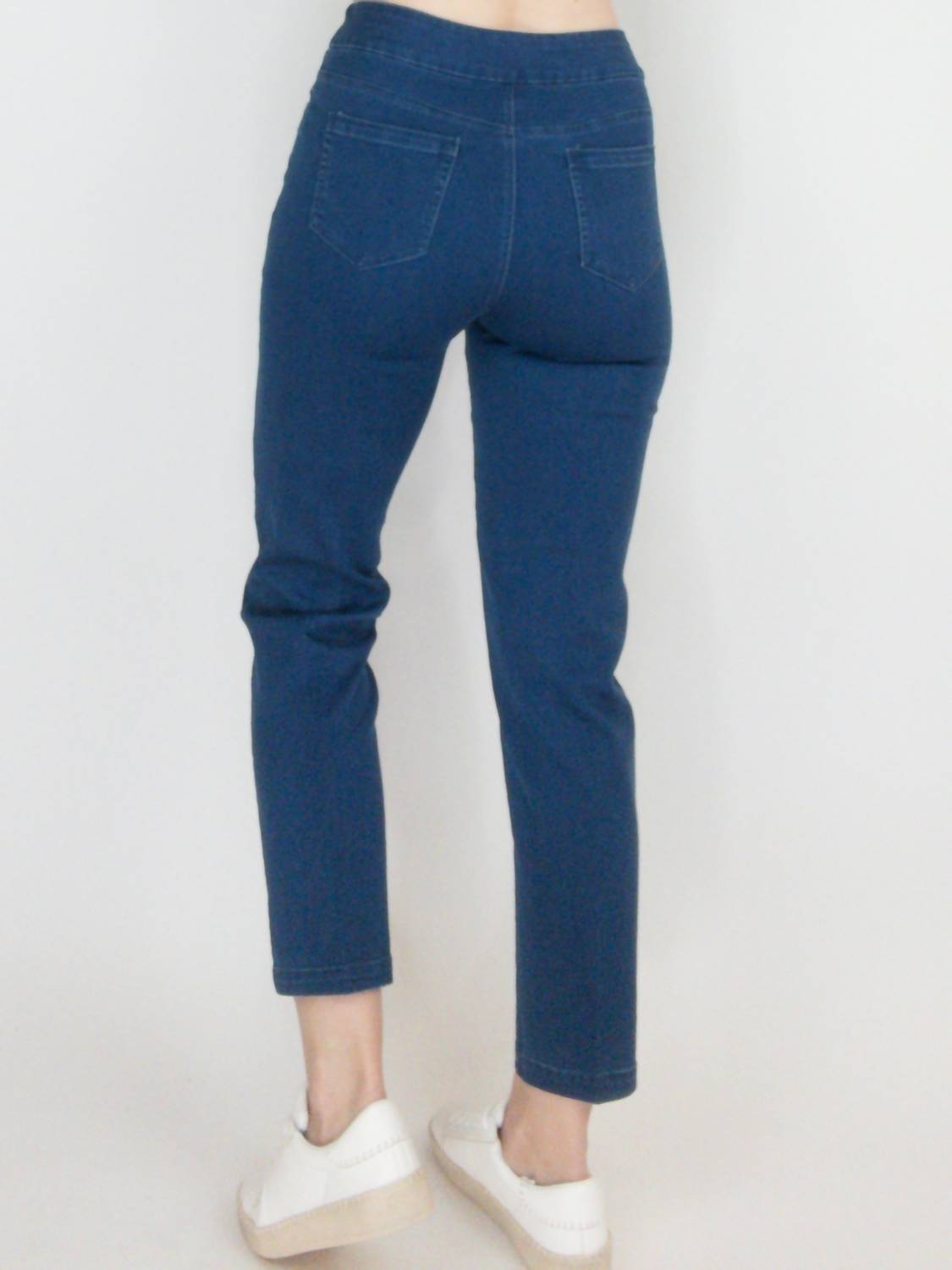 Stay on-trend and showcase your impeccable taste with these adaptable and stylish cropped pants. The perfect length to wear with your favorite mules. You'll love the fit! Introducing the Lulu-B Pull-On Denim Ankle Pant, a must-have for any wardrobe in versatile dark wash blue. These pants feature a regular fit with a straight leg design and convenient pull-on closure, offering effortless style and comfort. Expertly crafted from a stretchy cotton blend composed of 70% cotton, 27% polyester, and 3% spandex. Perfect for a minimalist trend, these solid pattern pants are equipped with pockets and are machine washable, with a recommendation to line dry.