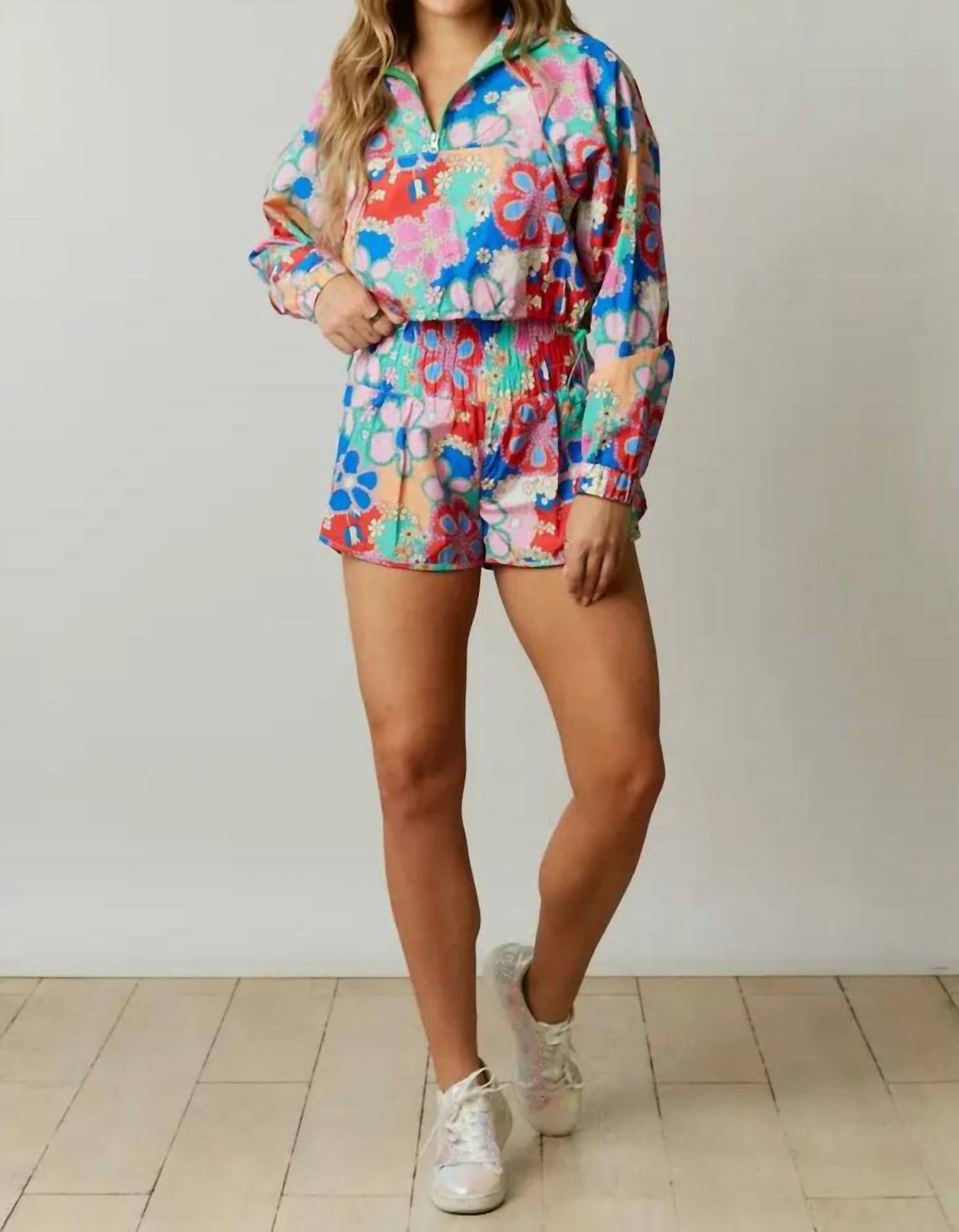 Elevate your vacation wardrobe with the Floral Print Sporty Shorts by Peach Love, a stunning piece in a vibrant multi-color floral pattern perfect for the spring season. These high-waist women's shorts feature a wide ruched elastic waistband, ensuring a comfortable and flexible pull-on fit. With no pockets, the design maintains a sleek and minimalist look, ideal for maximalist style lovers. Pair it with the matching jacket for a coordinated set.