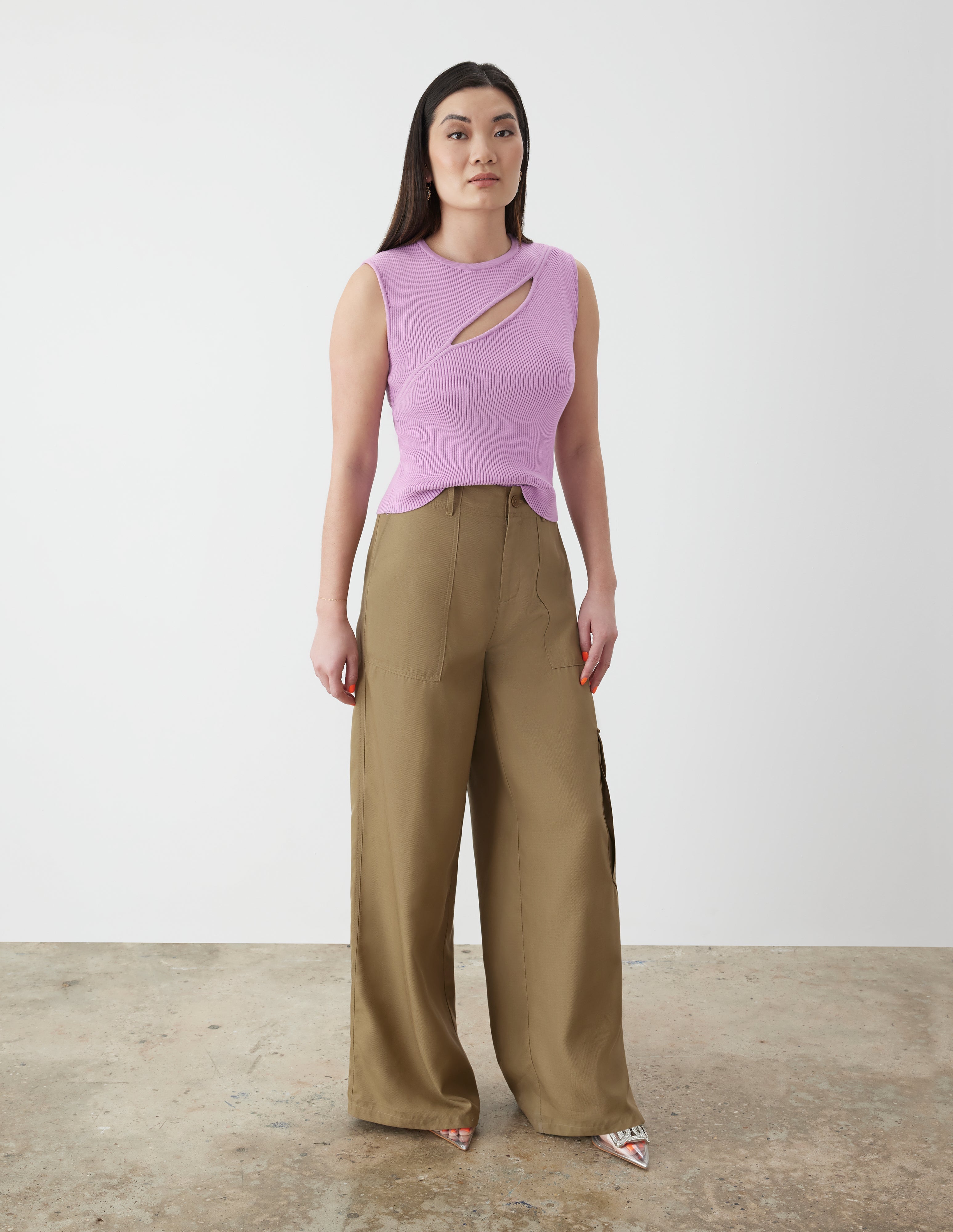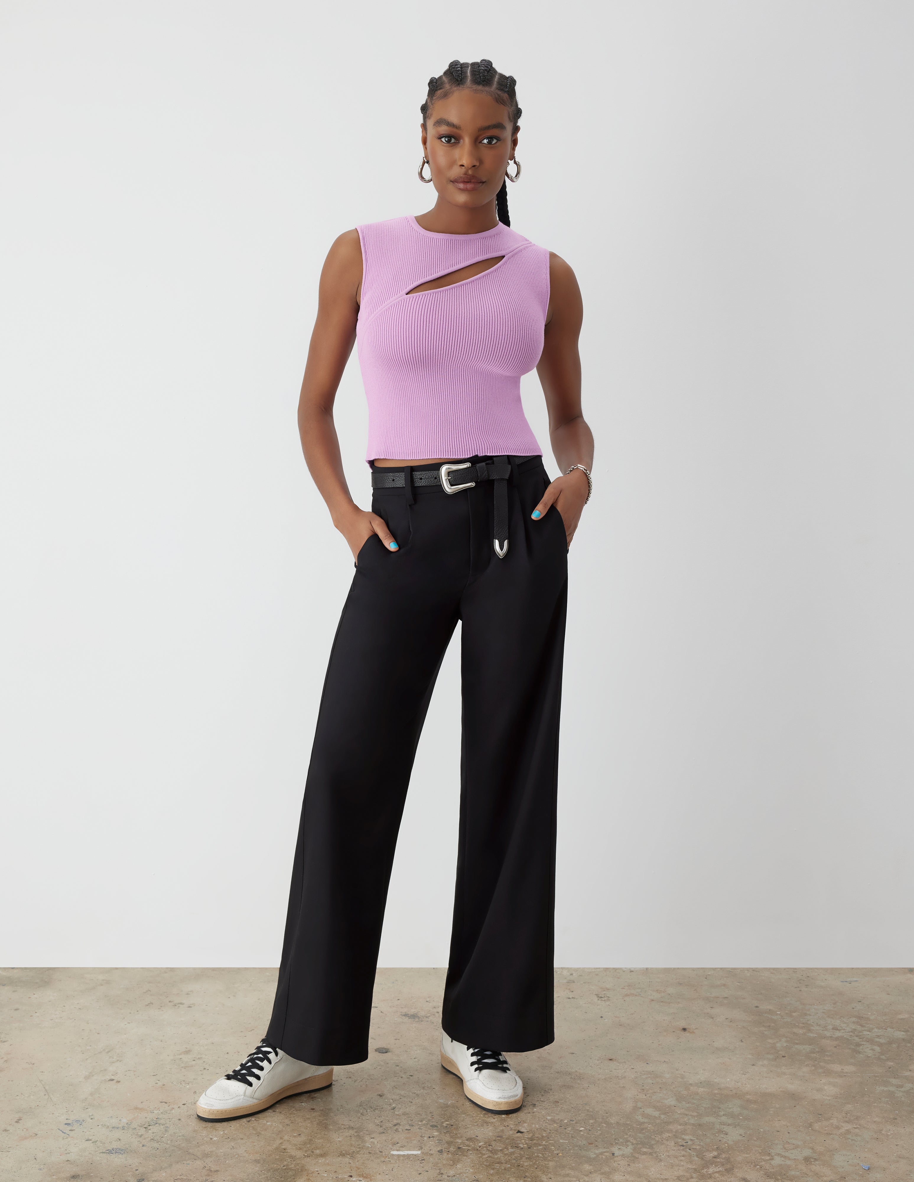 This pant features a thick stretch fabrication, sleek front seams, and a high-rise throwback style that stands out. An elastic waistband and pull-on design add convenience and ease.