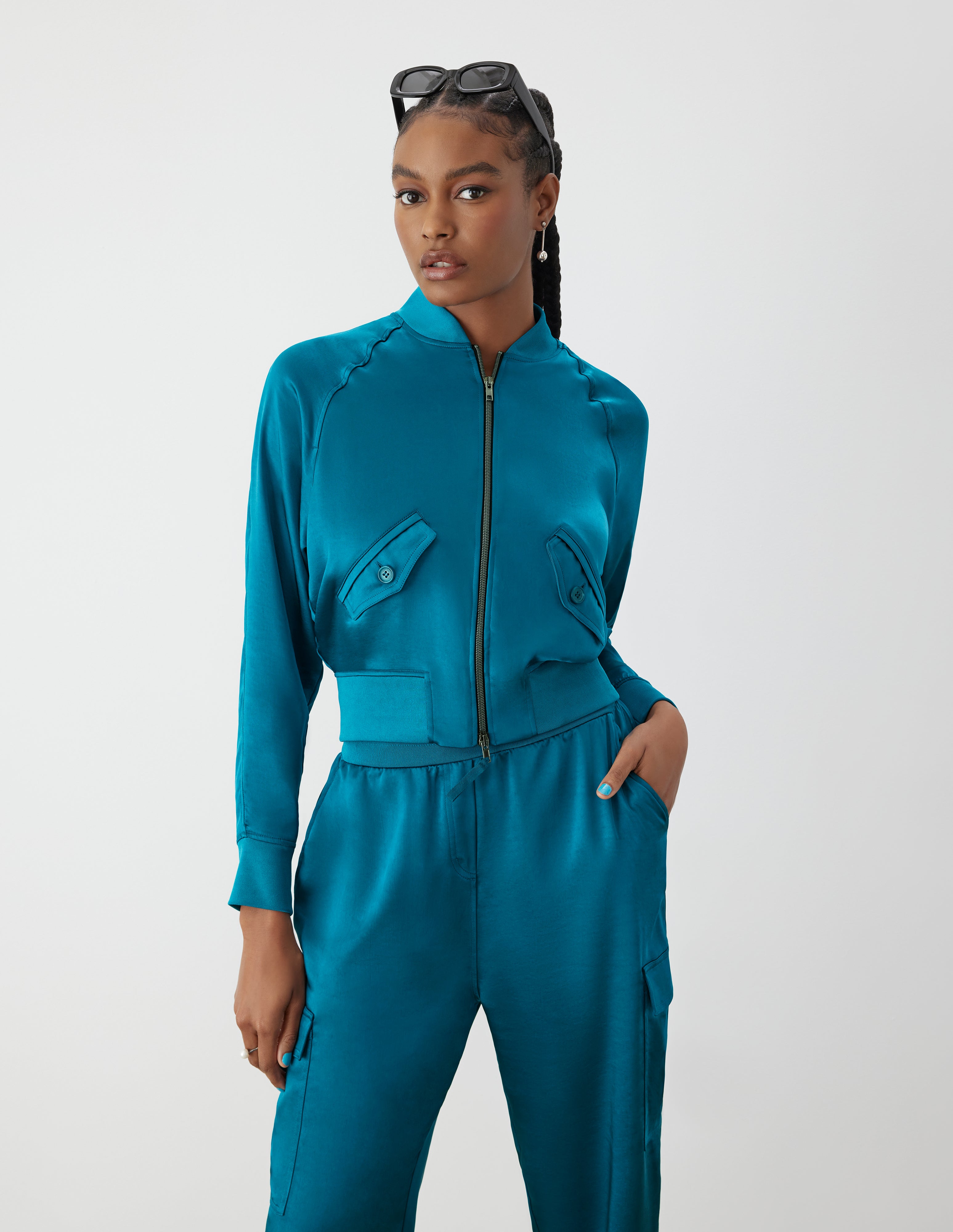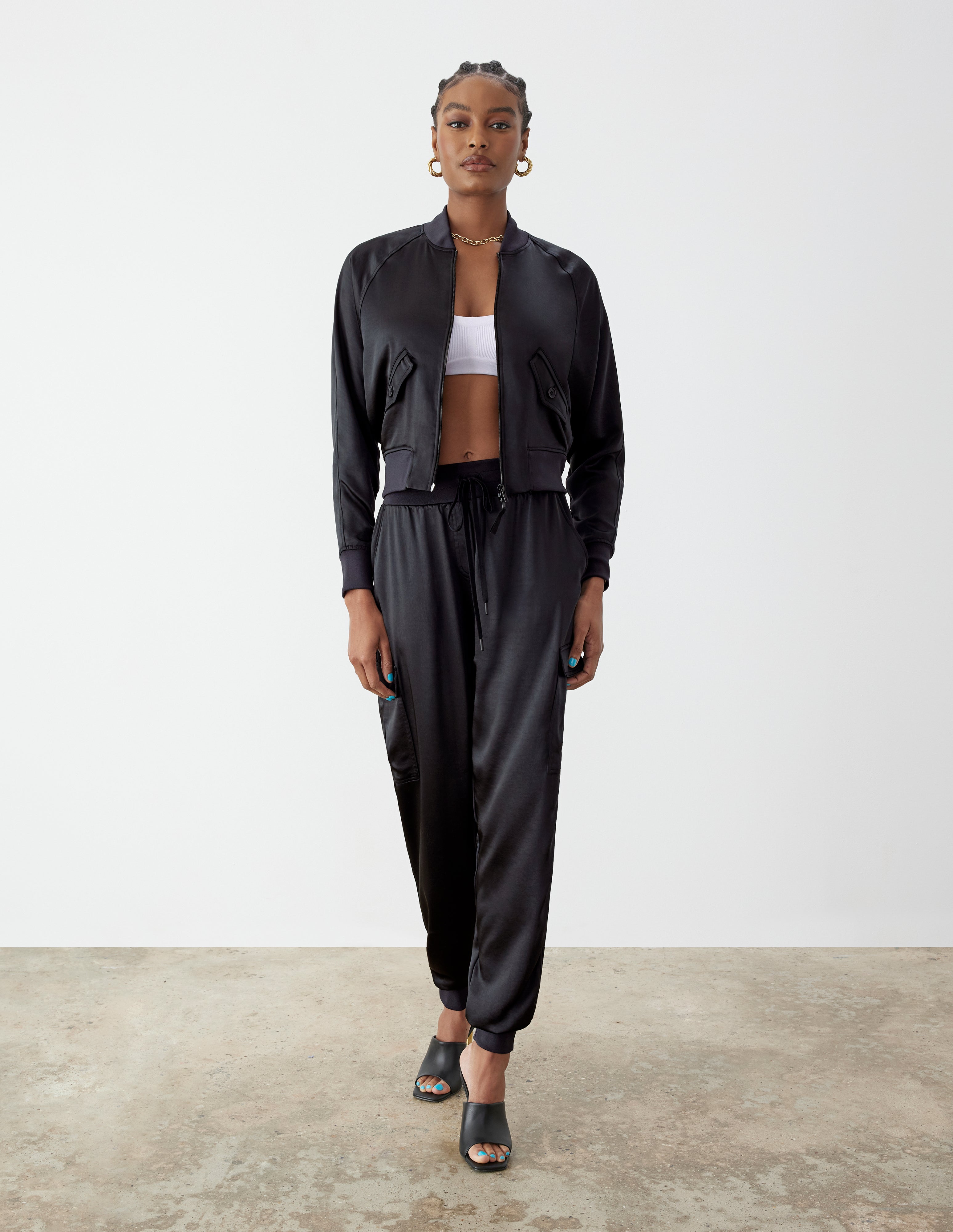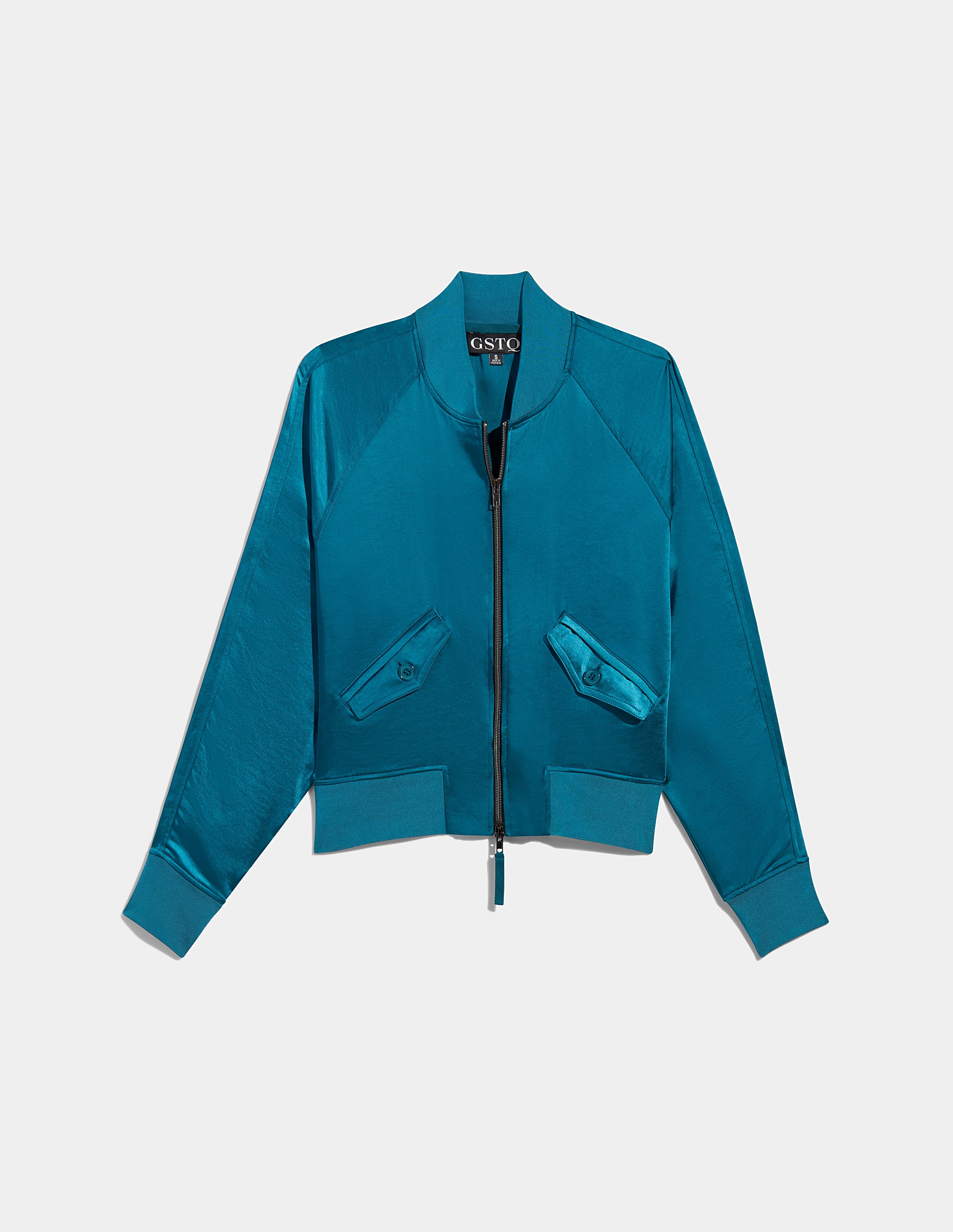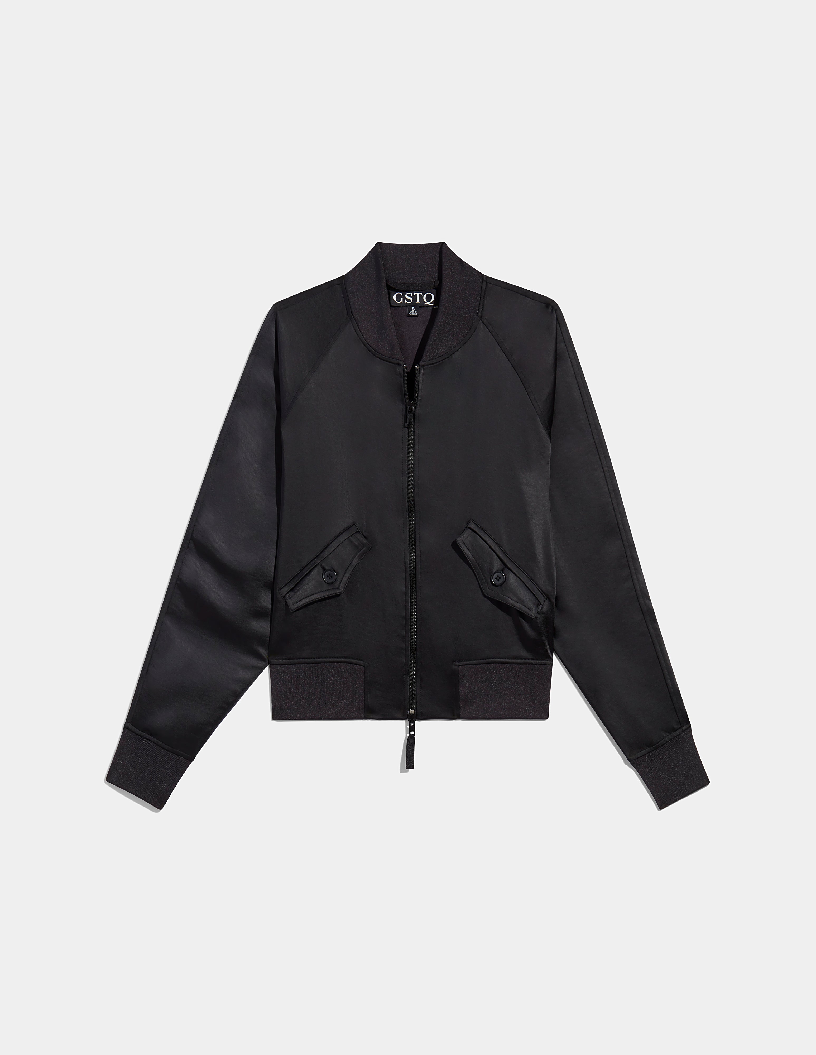 An evolution of our best-selling Sheer Bomber, this Satin Bomber features a two-way zipper and front side flap pockets. The rib trims add an edge to this GSTQ classic.