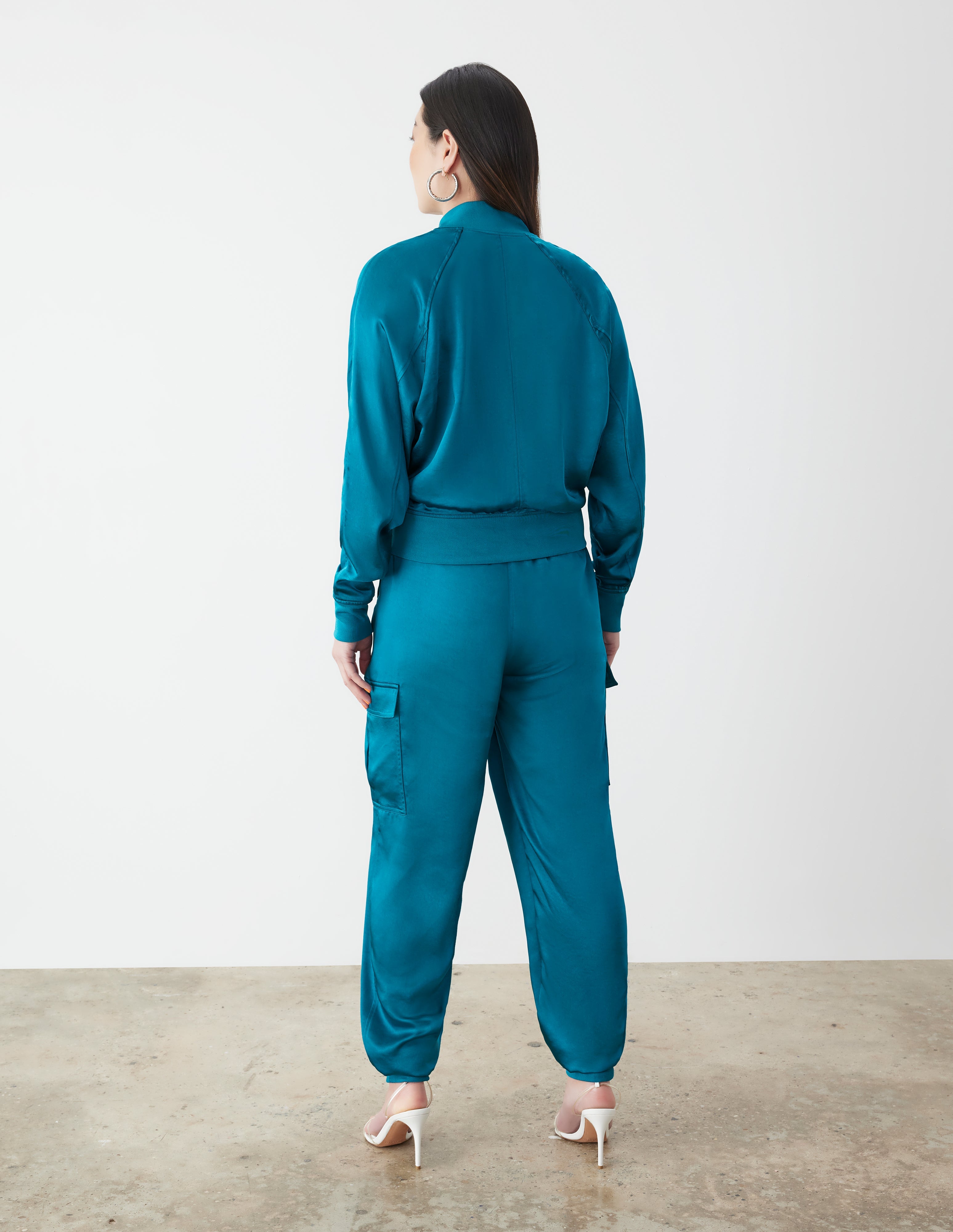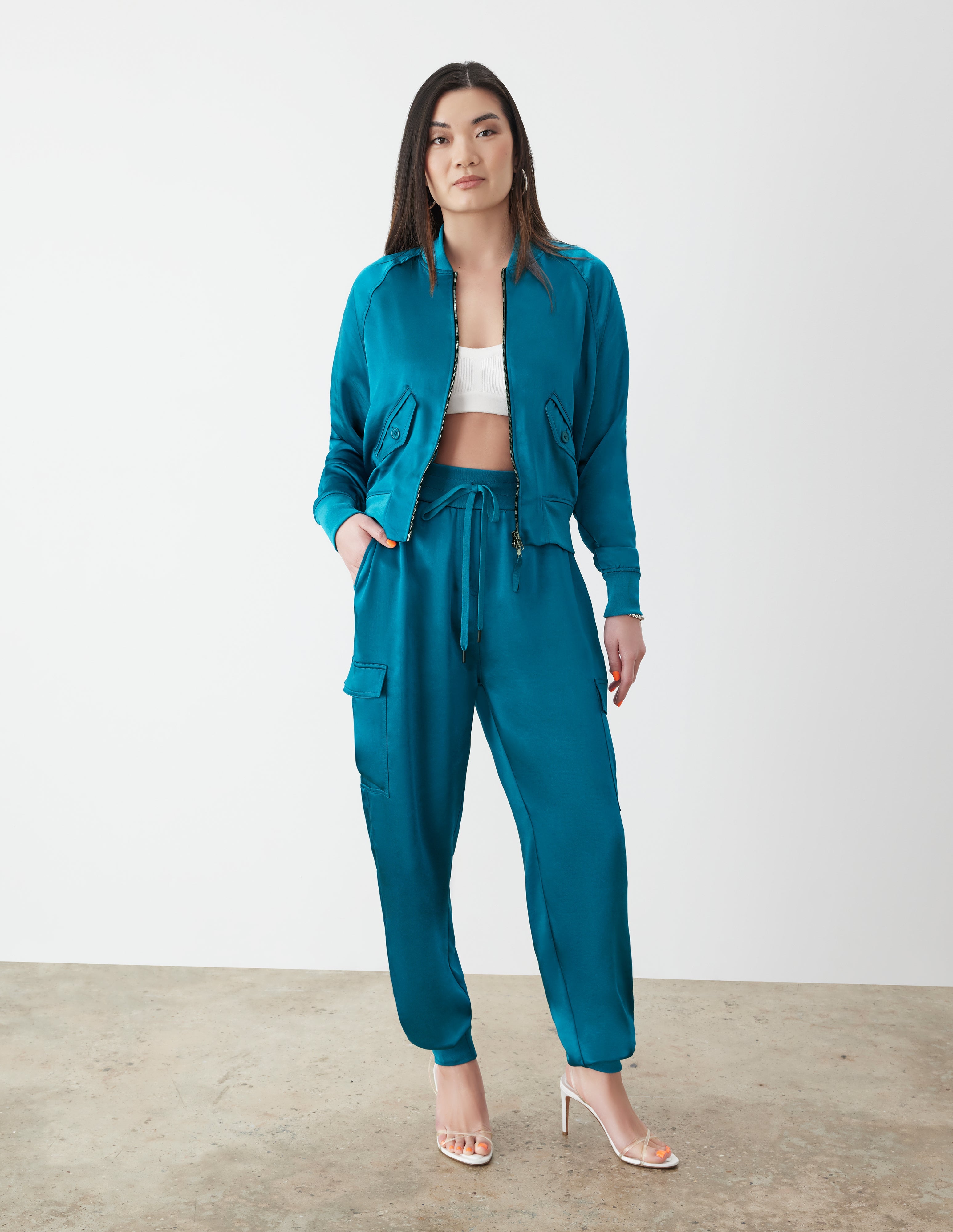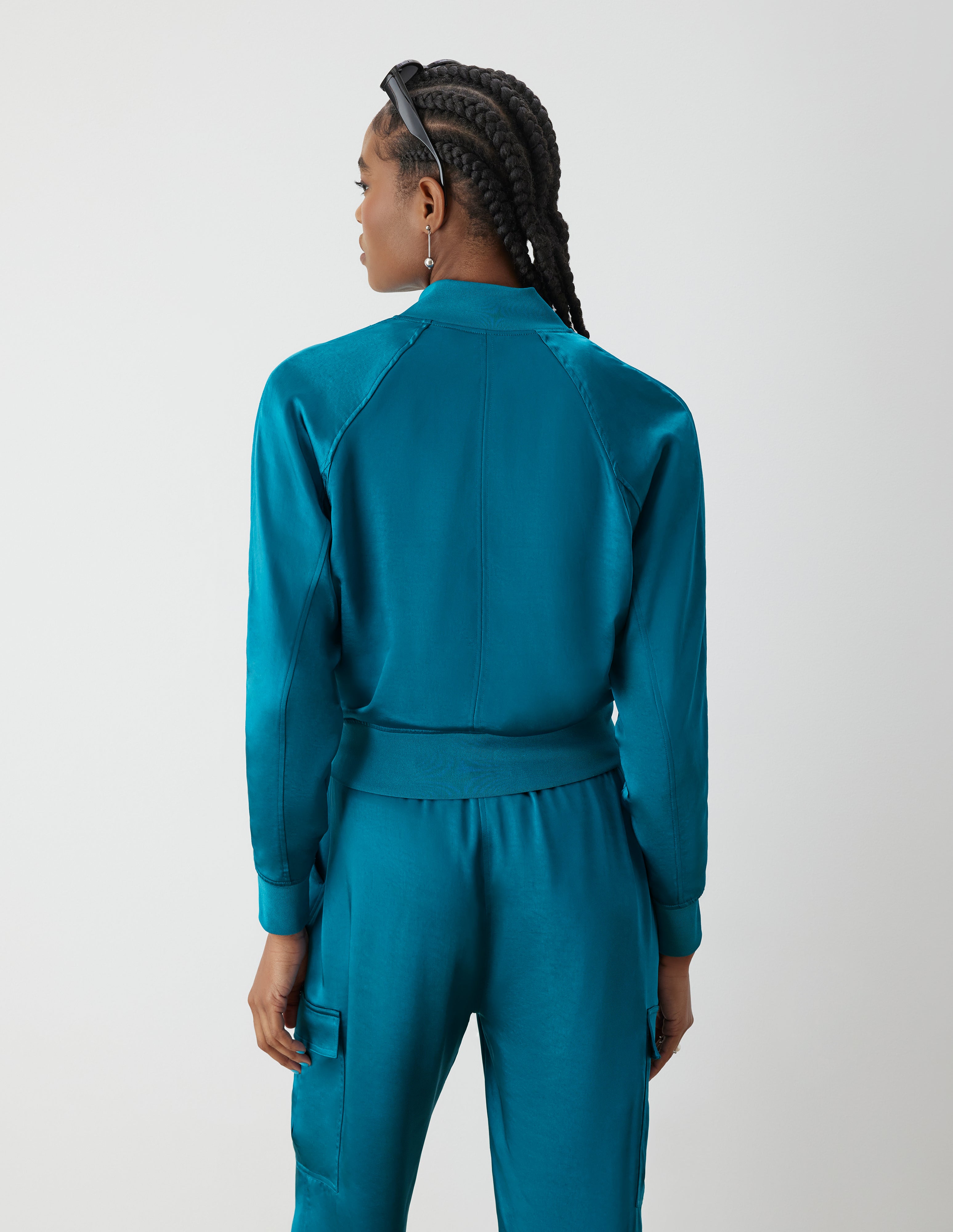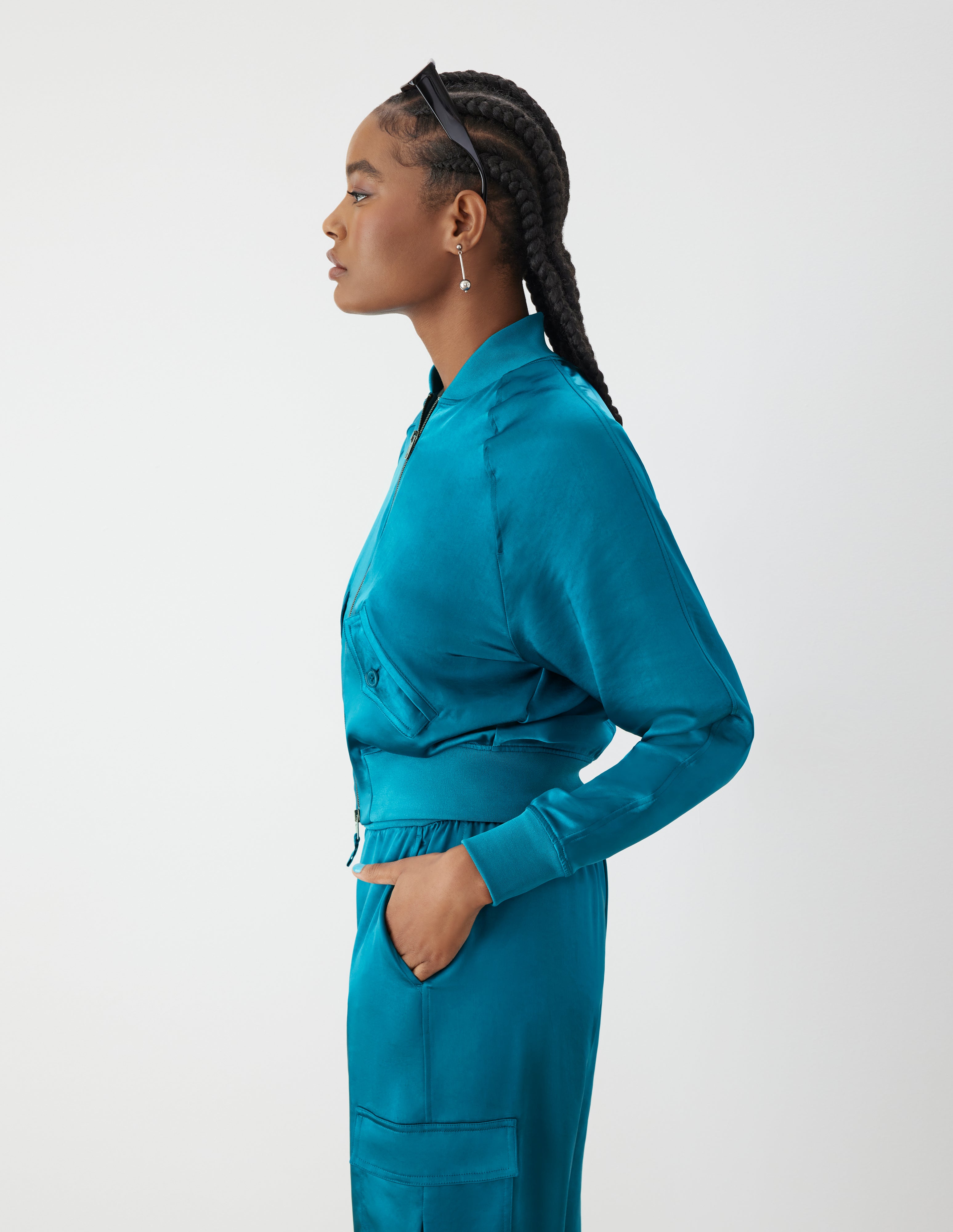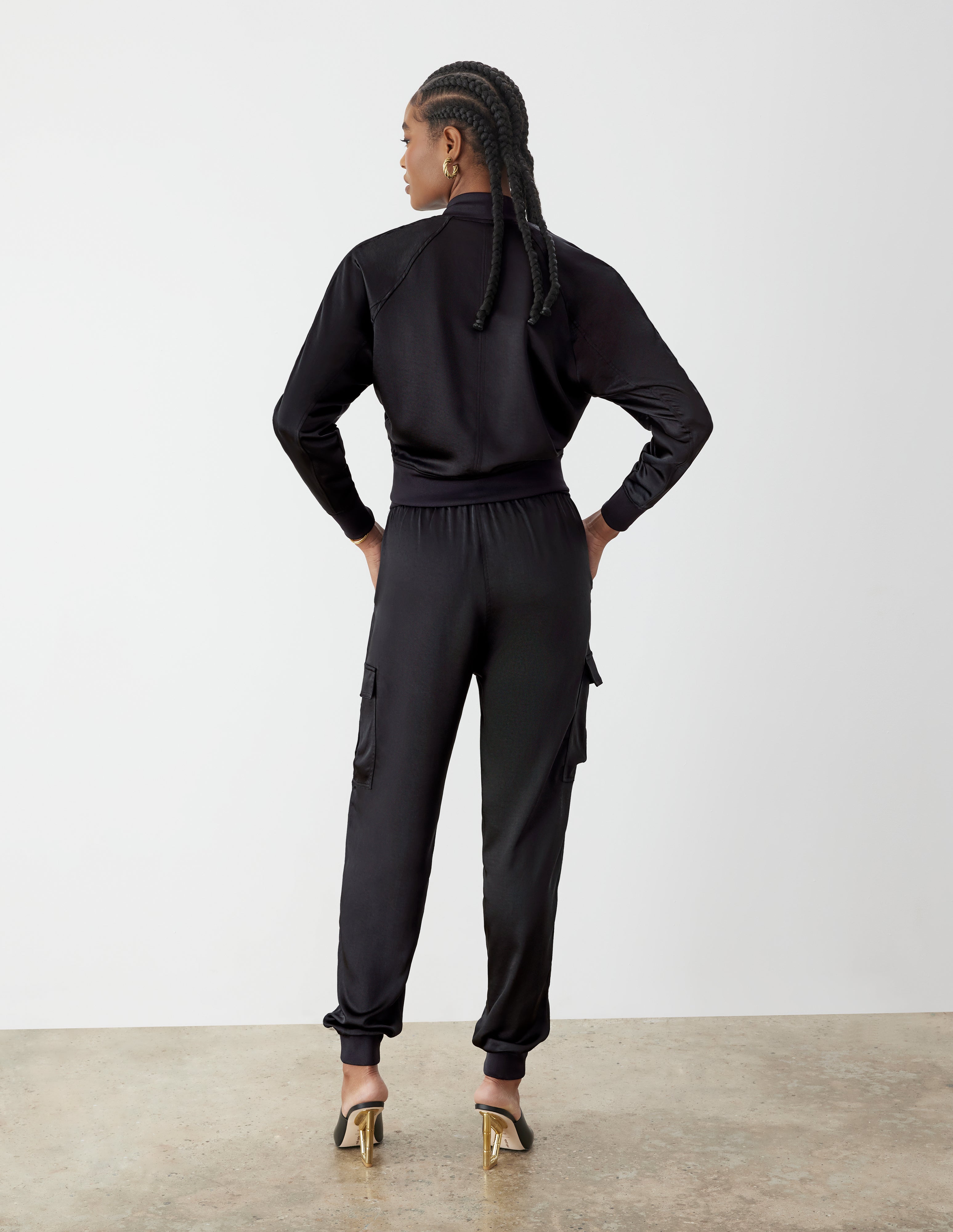 An evolution of our best-selling Sheer Bomber, this Satin Bomber features a two-way zipper and front side flap pockets. The rib trims add an edge to this GSTQ classic.