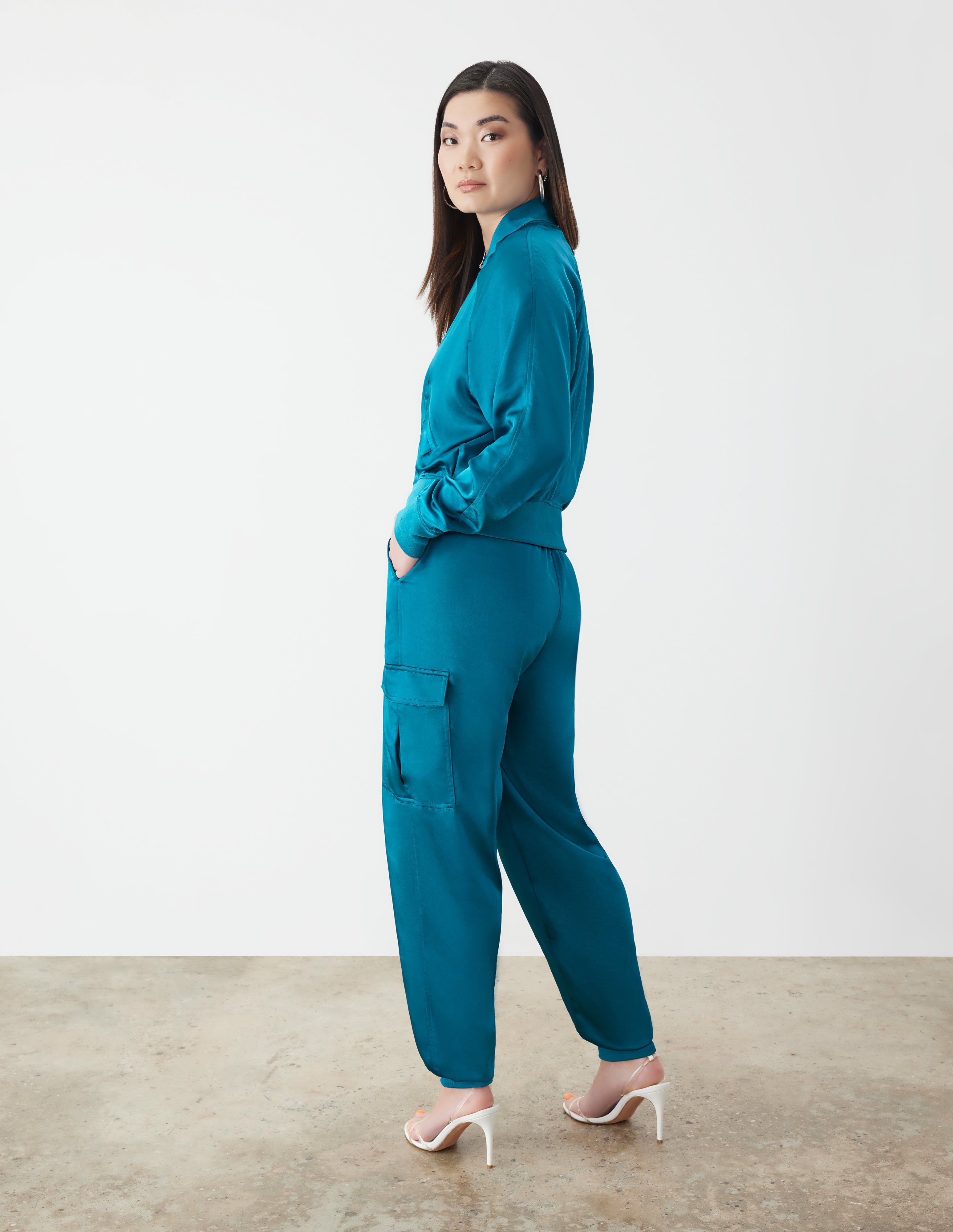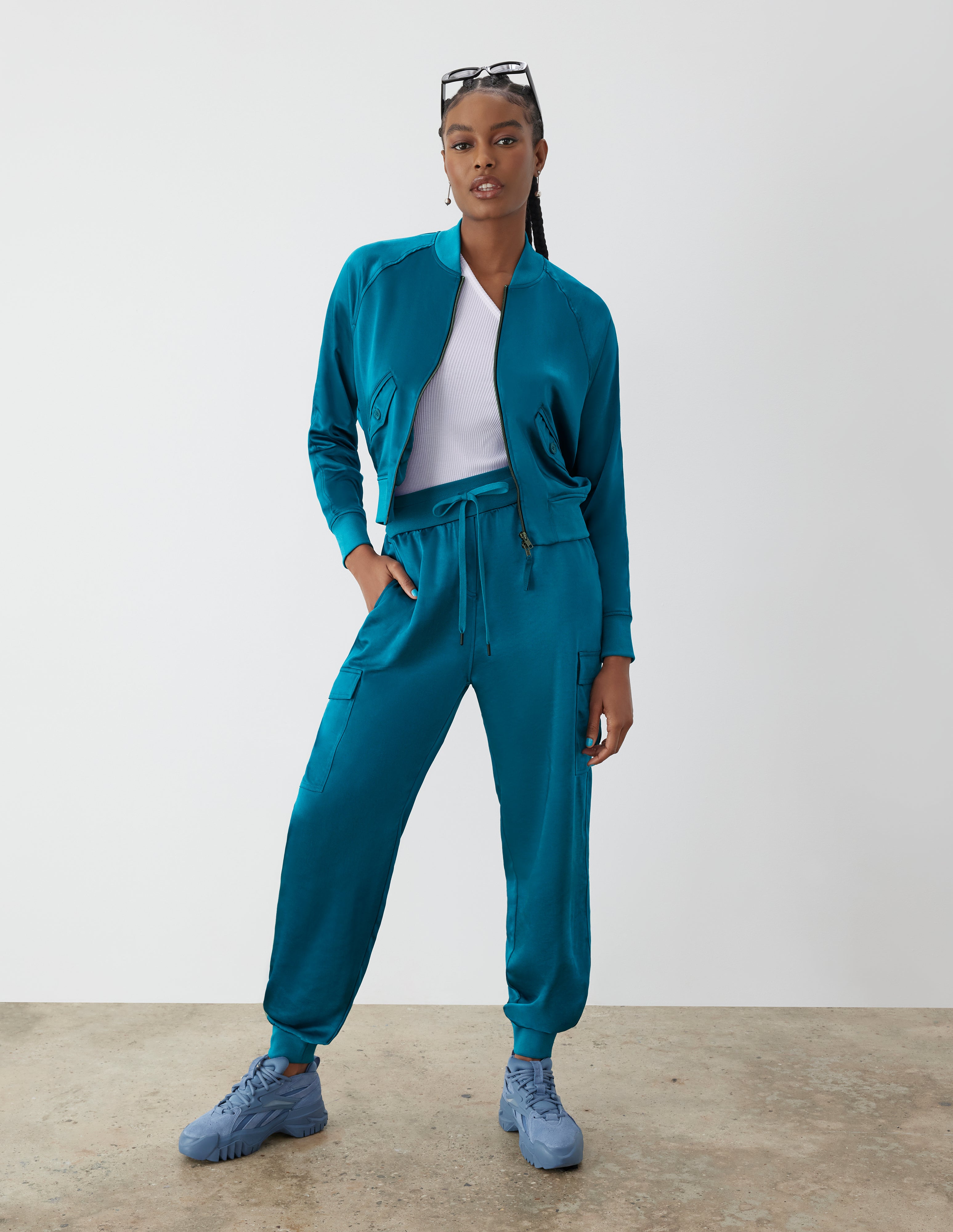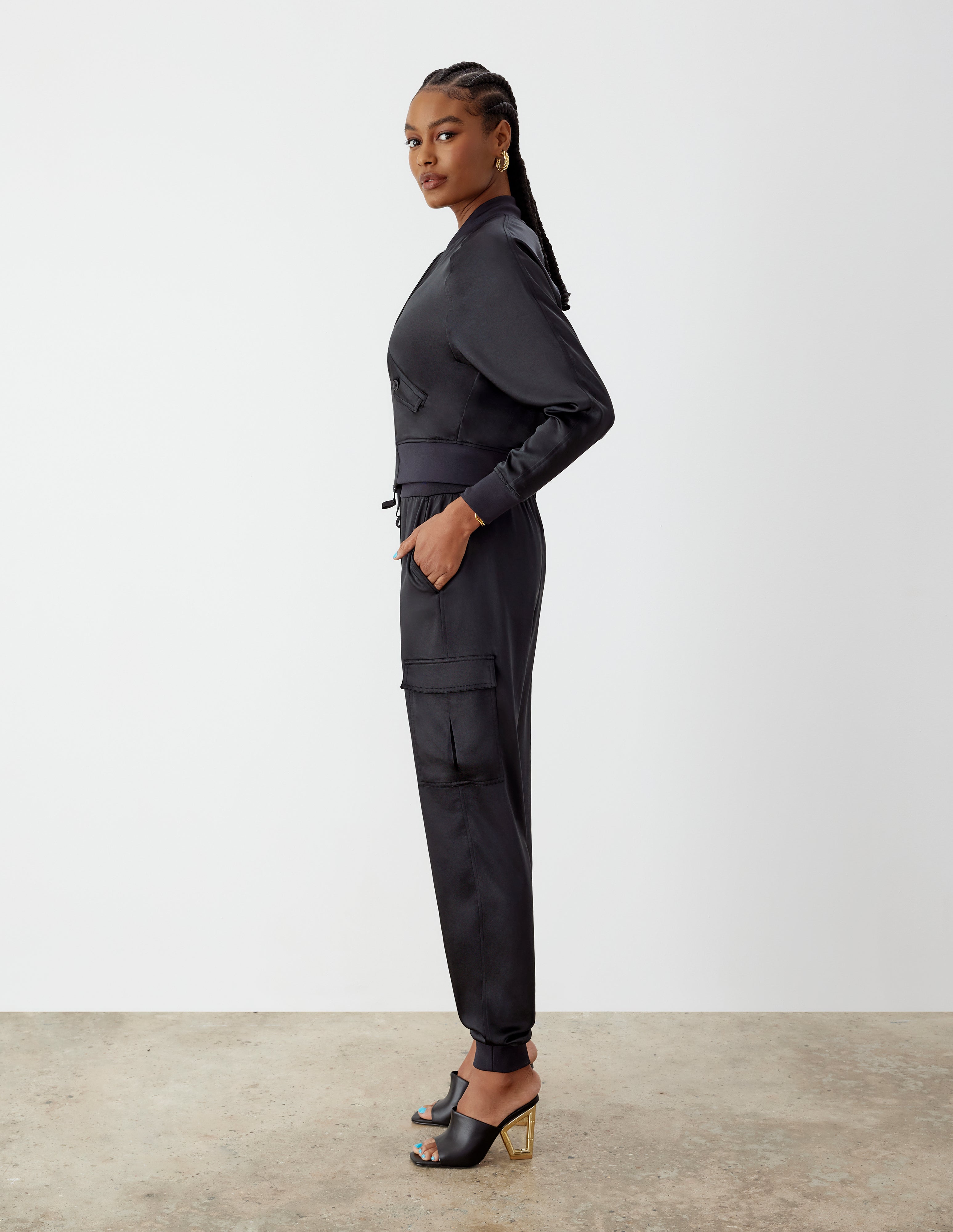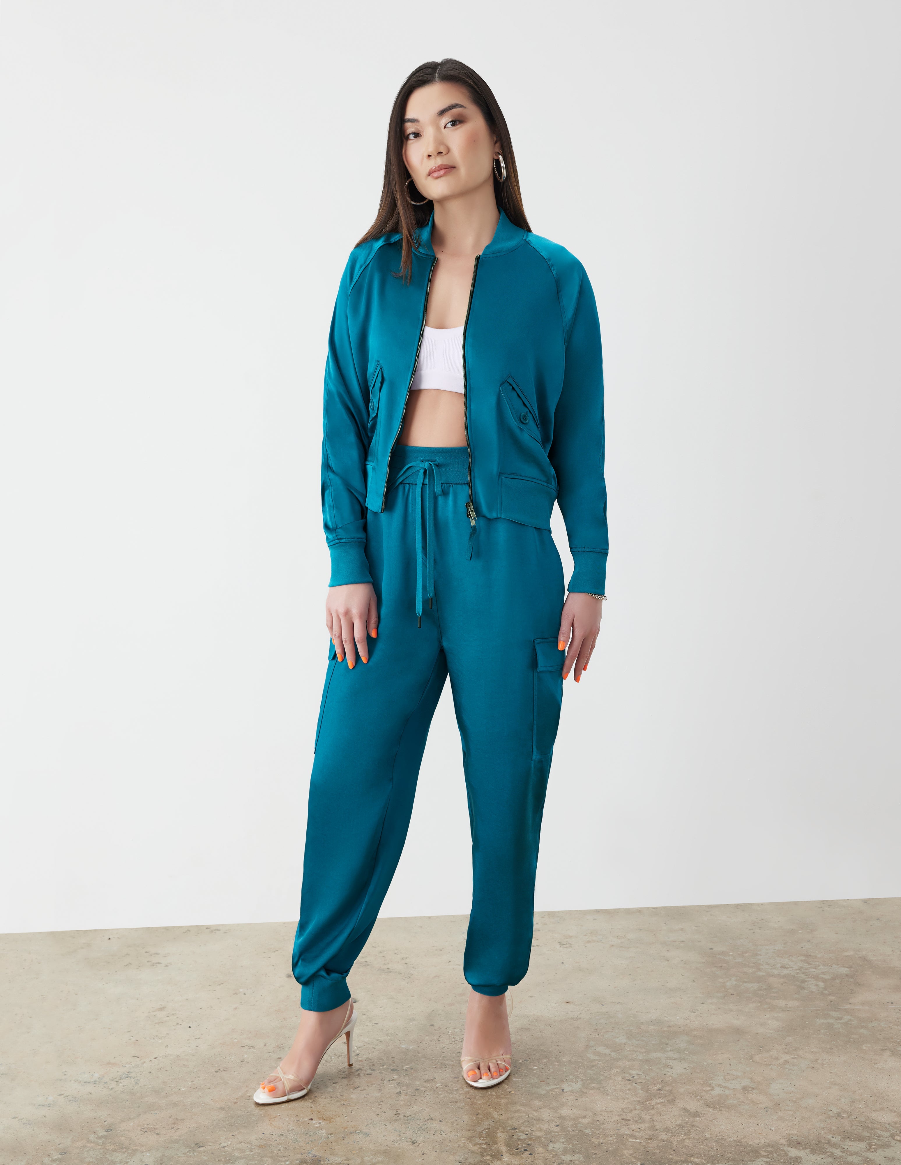 An evolution of our best-selling Sheer Bomber, this Satin Bomber features a two-way zipper and front side flap pockets. The rib trims add an edge to this GSTQ classic.