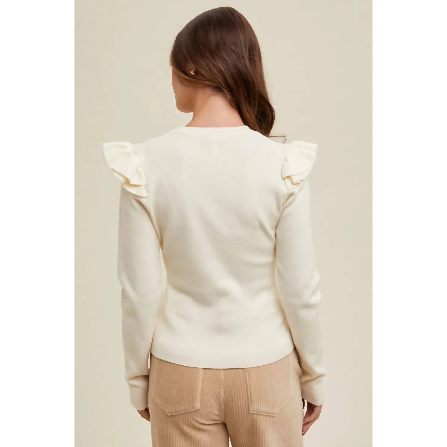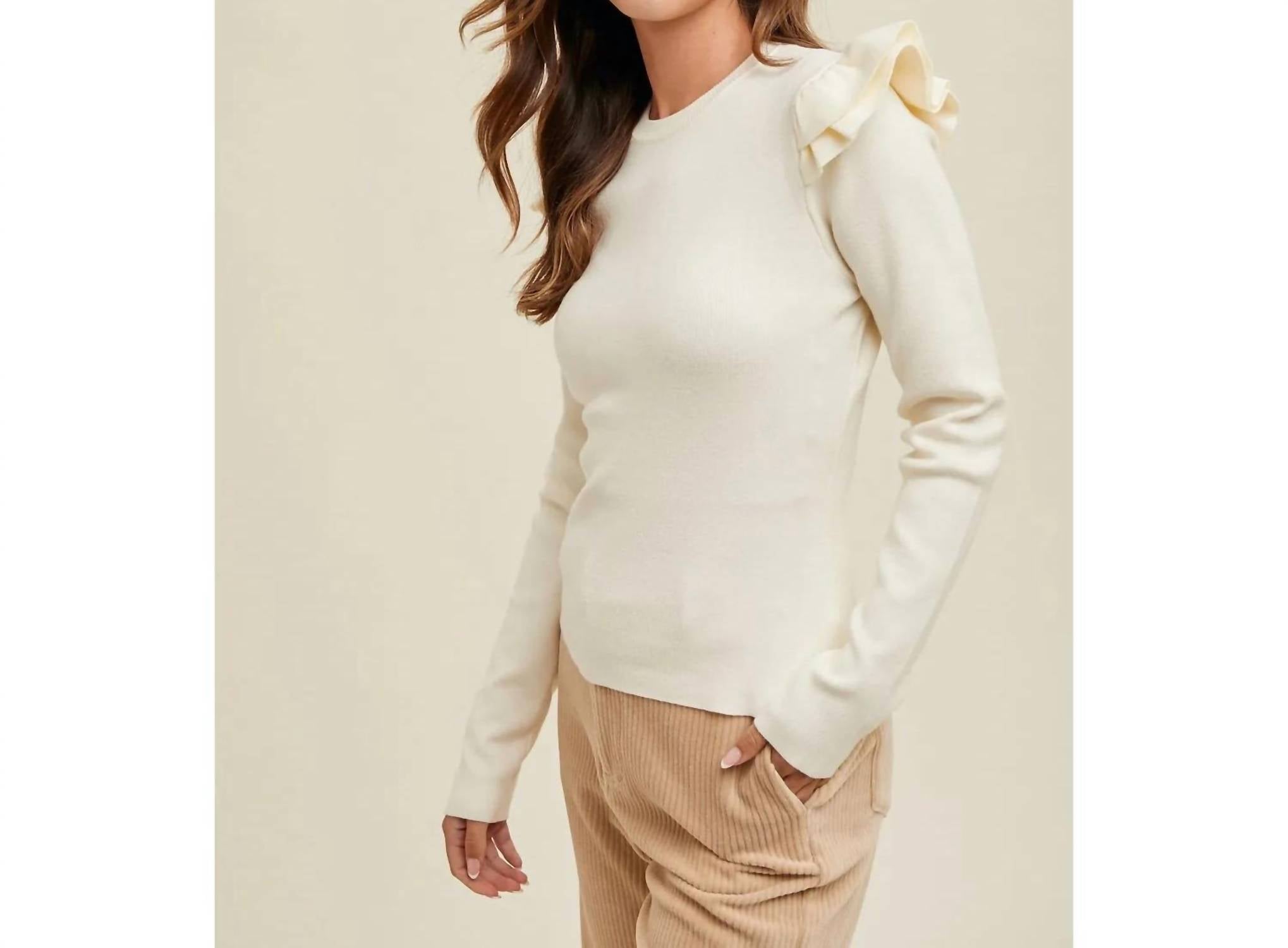 Experience the perfect blend of comfort and style with this trendy crew neck sweater, designed to effortlessly elevate your wardrobe. Pair it with your favorite denim and loafers for the perfect look. Enhance your wardrobe with the Georgette Top by WISHLIST, crafted to blend comfort with minimalist elegance. This cream sweater features long, ruffled sleeves and a crewneck, perfect for a dressed-down yet sophisticated look. Made from a viscose blend, it offers a soft feel with 50% viscose, 28% polyester, and 22% nylon. Closure: Pull on. Care: Hand wash and line dry. Ideal for fall travel and Thanksgiving gatherings.