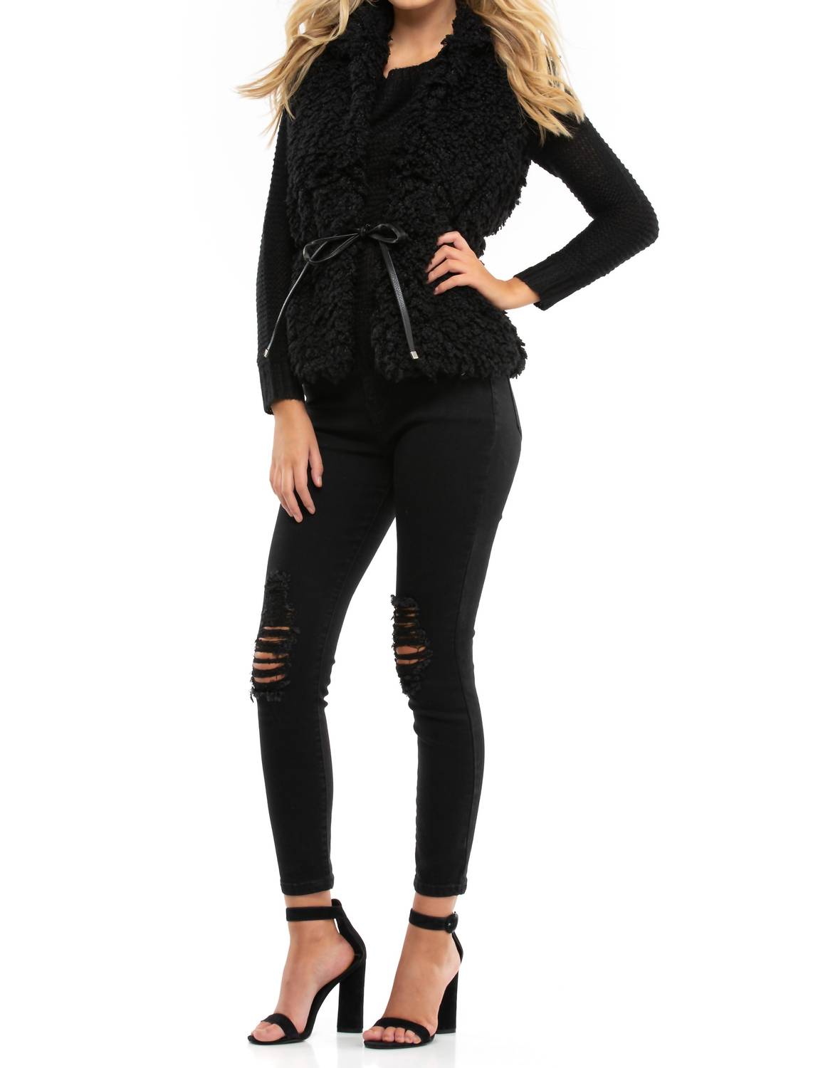 Throw this vest over an all black outfit for a perfectly polished look. Step into quiet luxury with the WYLDR Country Days Fluffy Gilet, a textured faux fur vest that radiates opulence. Designed with a sleeveless silhouette and a chic V-neckline, this fall-ready vest comes in a versatile black. Featuring a pull-on closure, it includes a removable faux leather belt for added style. Perfect for vacation outings, this fully lined piece combines comfort with sophistication, making it a must-have in your travel wardrobe.