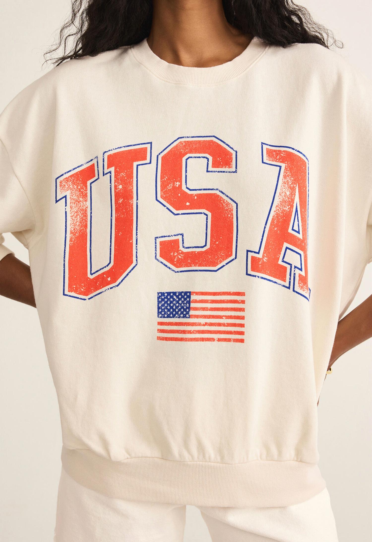 Stay warm and stylish in this versatile and effortlessly cool knitwear staple. Wear it alone or layered, it's the perfect sweater for the season and you'll wish you had it in every color. Experience casual comfort with the Flag Sunday Sweatshirt by Z Supply in a classic Sea Salt hue, perfect for winter streetwear or Game Day celebrations. This cozy oversized sweatshirt, featuring long sleeves and a crewneck, boasts an all-American "USA" graphic with an American flag. Crafted from 100% cotton brushed fleece, its midweight design ensures warmth and comfort. Care is easy with machine wash cold and tumble dry low instructions; wear it with pride or save it for the 4th of July. Garment length ranges from 25" to 27" and measurement details are available for the ideal fit. Model is 5′9″ wearing a size S.