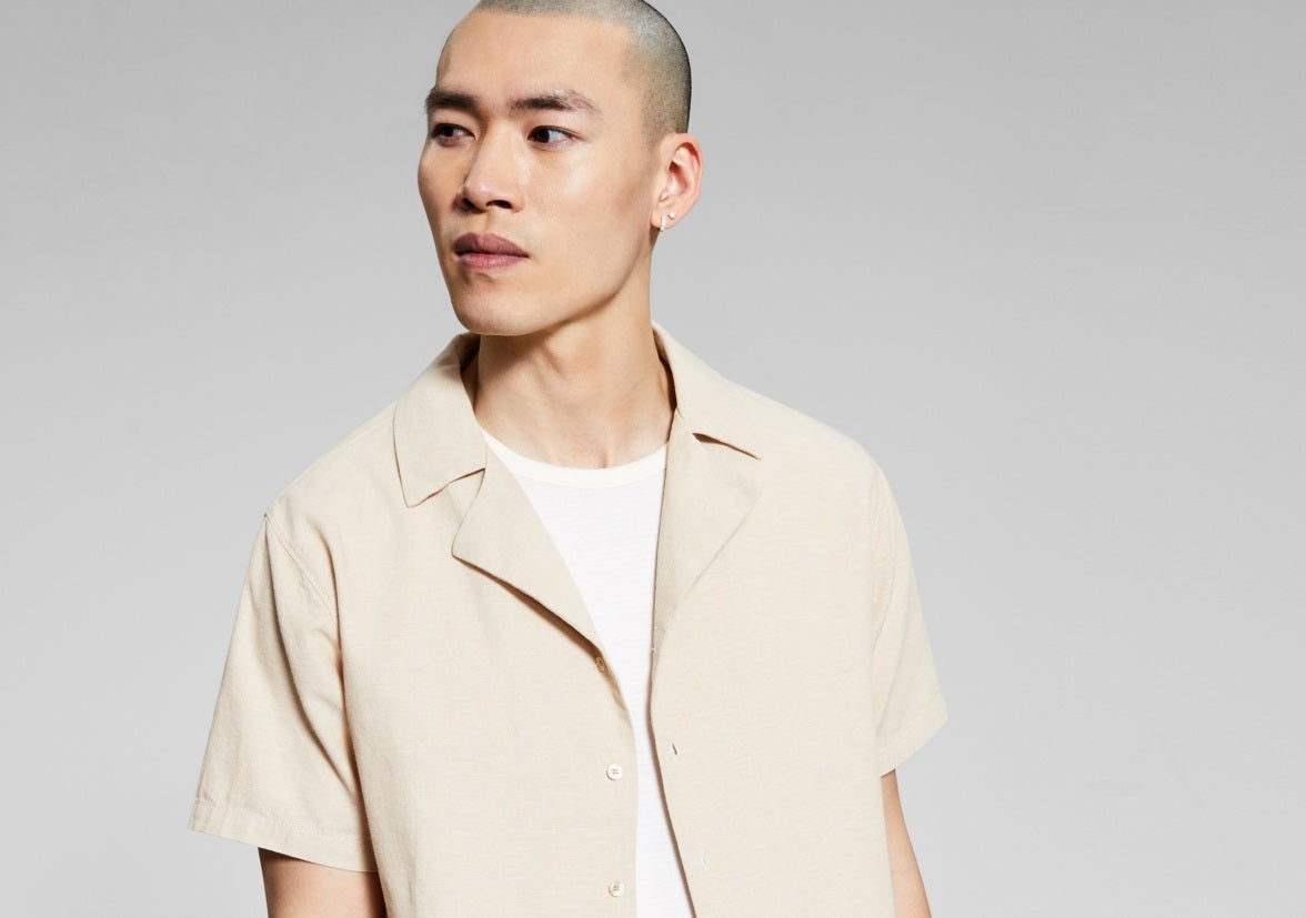 In an allover vertical stripe pattern| this short-sleeve camp shirt from And Now This is perfect for your casual| kicked back style