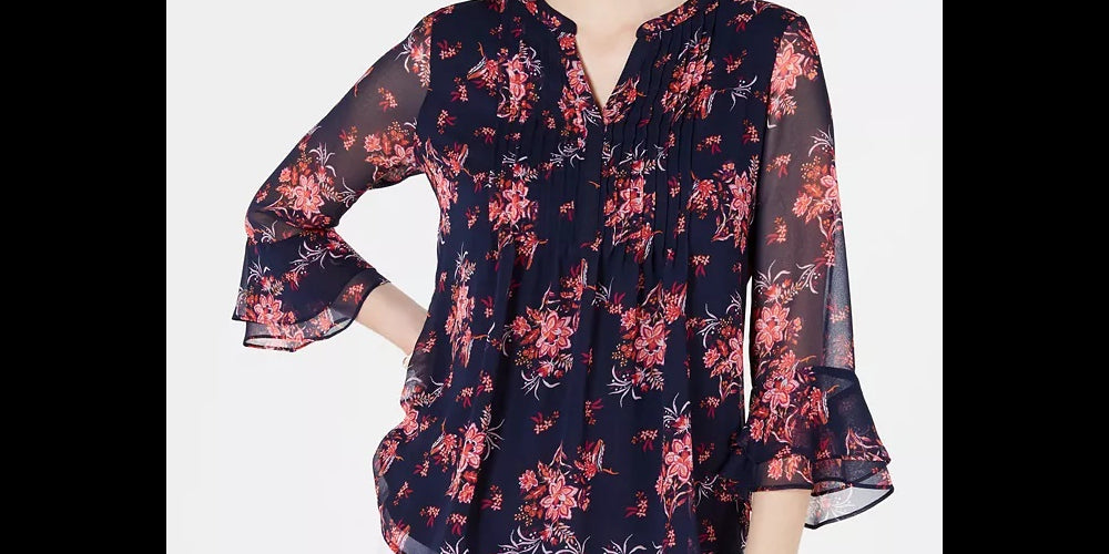 Relaxed fit; hits at hip; approx. 27" long|Due to generous sizing, we suggest sizing down for the perfect fit|Split neckline|Pintucks at front|Sheer 3/4-sleeves with double ruffle cuffs