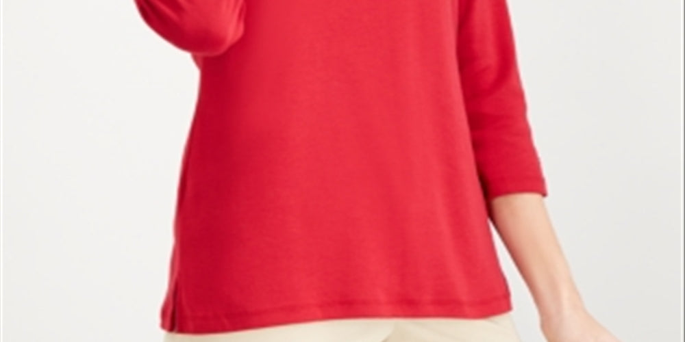 Keep your casual style updated with effortless appeal in this Karen Scott cotton top with a contrasting neckline inset and grommet trim.| Hits at hip; approx. 26 long| Due to generous sizing| we suggest sizing down for the perfect fit| Split neckline with contrasting striped inset| Grommet trim at neckline; striped detail at cuffs| 3/4-sleeves