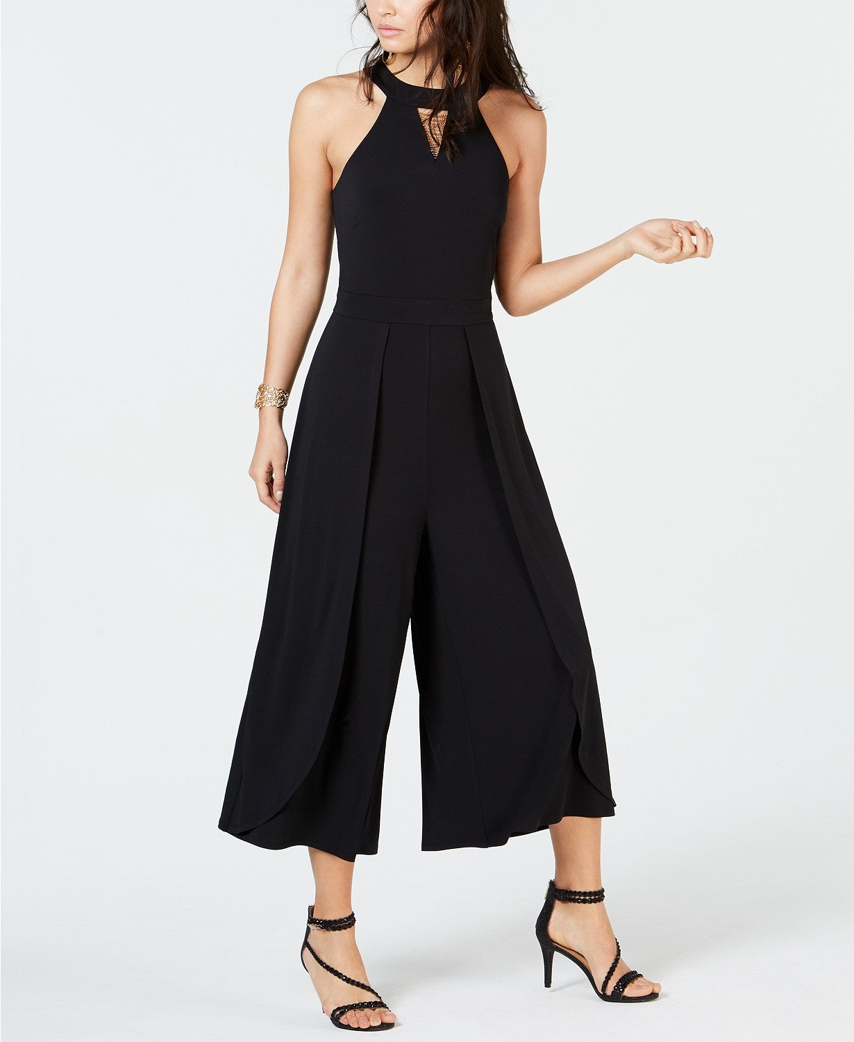 Approx. model height is 5'10" | Crewneck; back zipper closure | Keyhole cutouts at neckline; chain detail at neckline | Polyester/spandex; lining: polyester | Machine washable | Imported