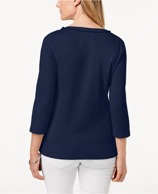 Karen Scott Women's Cotton Ruffle Trim Henley Top Blue Size Large