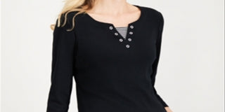 Karen Scott Women's Knit 3/4 Sleeve Split Neck Top Black Size Large