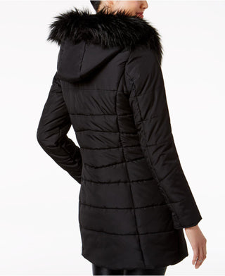 Maralyn & Me Juniors' Hooded Faux-Fur-Trim Puffer Coat Black Size Small