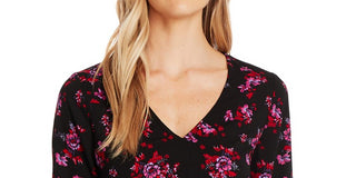 CeCe Women's V Neck Floral Print Rich Blouse Black Size M