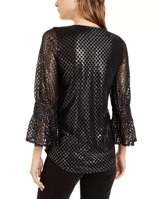 Alfani Women's Petite Metallic-Print Smocked-Sleeve Top Gray Size Small