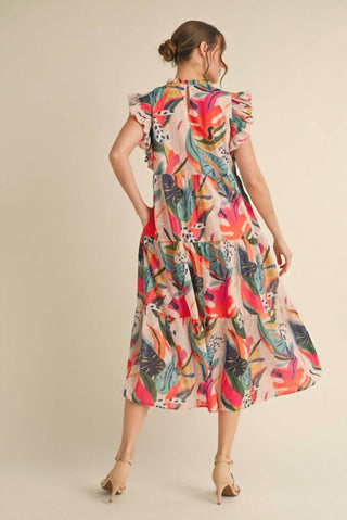 Jodifl - Tropical Print Ruffle Sleeve Midi Dress