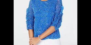 Alfani Women's Petite Printed Ruched-Sleeve Mesh Bubble Top Blue Size PS