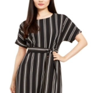 Alfani Women's Striped Short Sleeve Jewel Neck Knee Length Fit Flare Dress Black Size Large