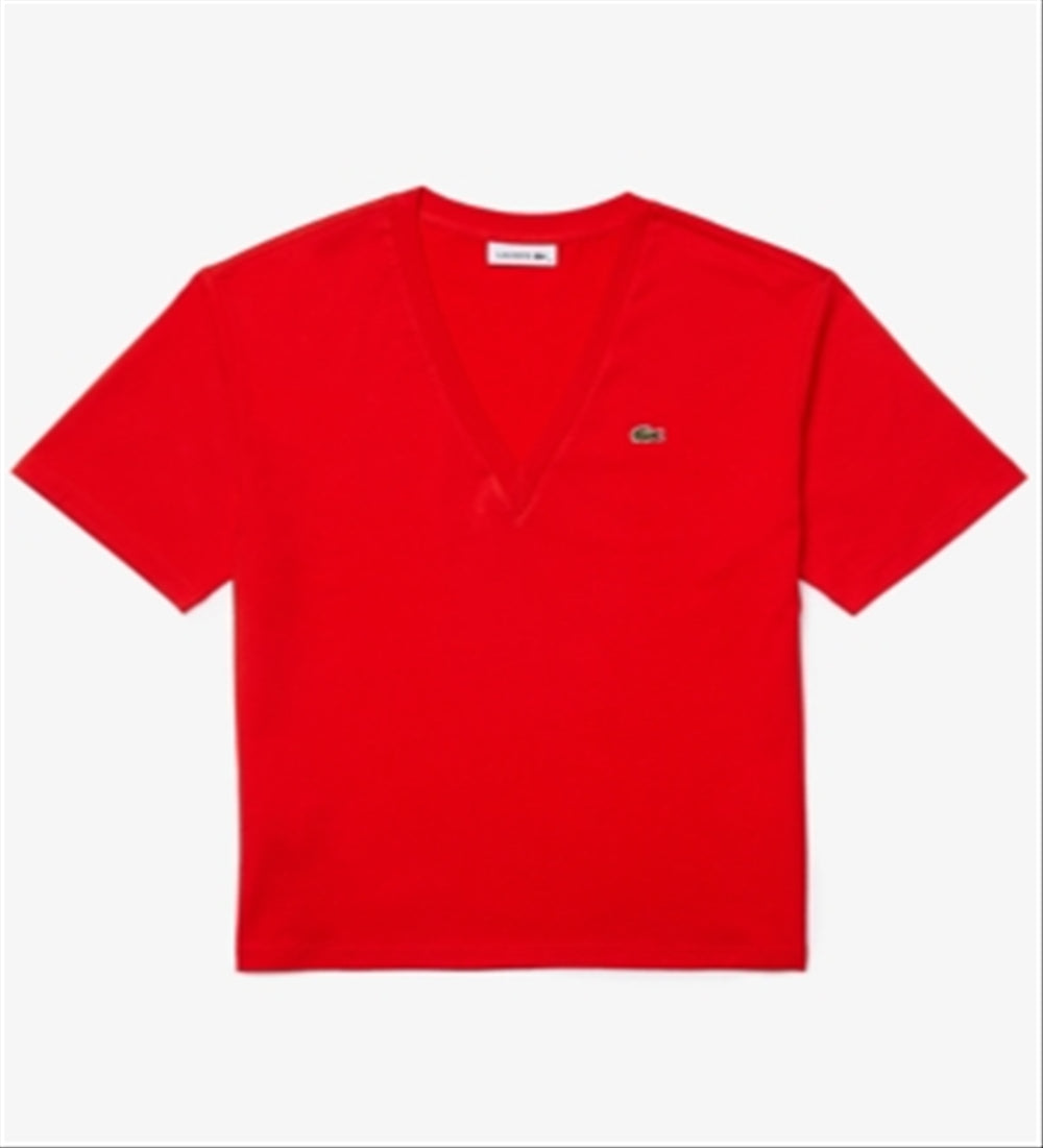 Lacoste Women's Relaxed Fit Solid Cotton Jersey V Neck T-Shirt Red Size 38