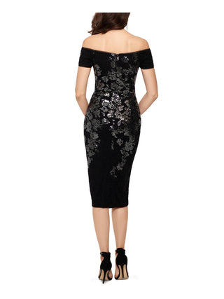 Xscape Women's Sequined Off the Shoulder MIDI Dress Black Silver Size 6 Petite