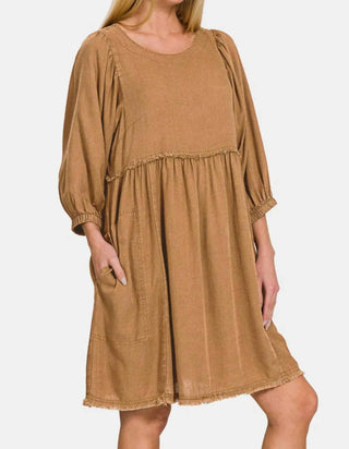 Zenana - Washed Linen Pleated Puff Sleeve Babydoll Dress