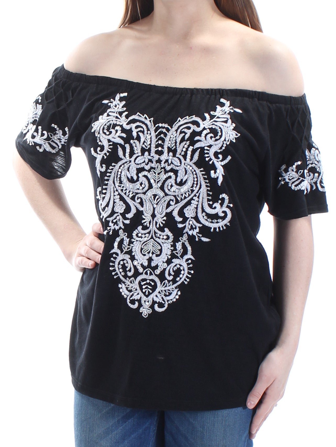 INC Women's Short Sleeve Off Shoulder Top Black Size Small