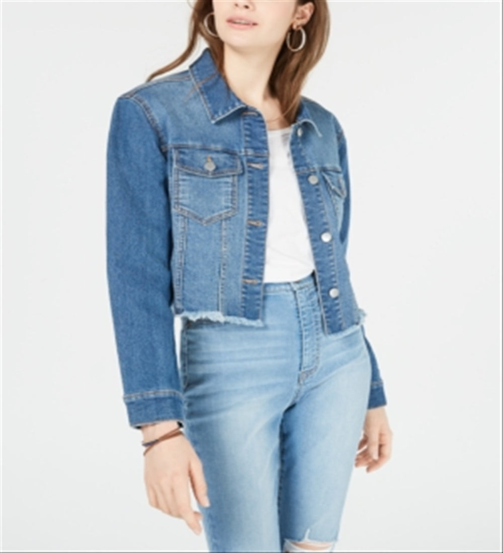 Tinseltown Juniors' Cropped Raw-Edged Denim Jacket Bright Blue Size Small