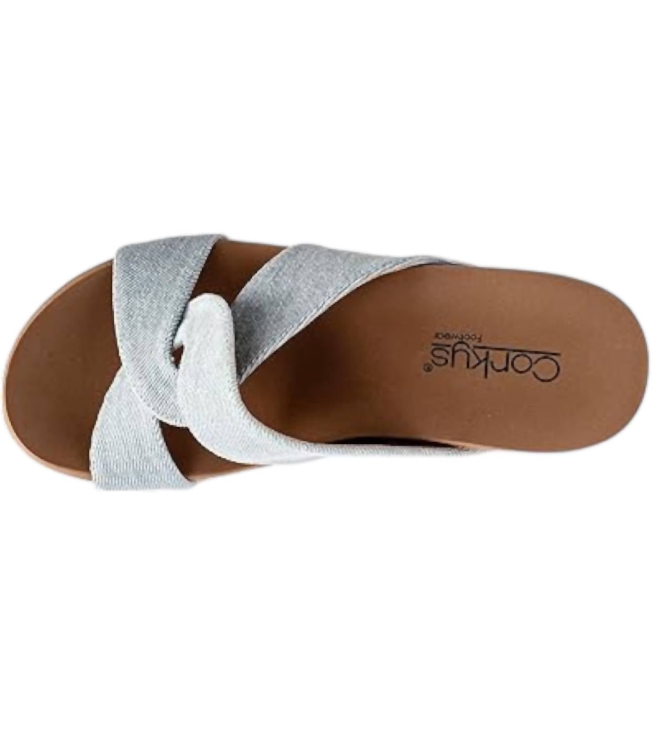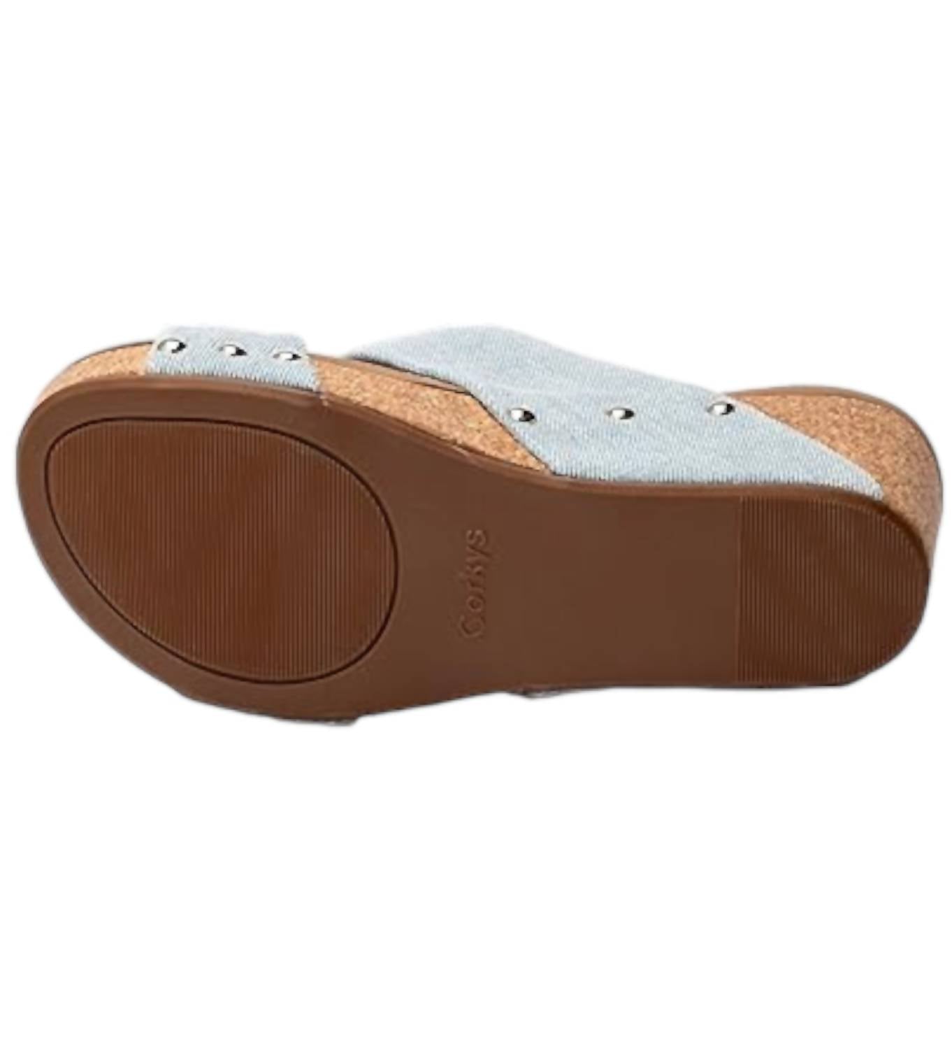 Timeless wedges that will be relevant season after season. Step confidently into summer gatherings with the Bonny Light Blue Denim Wedge Heel by Corkys Footwear. These stylish wedges feature a 2.5-inch mid-heel in a classic denim material, perfect for comfortable all-day wear. Designed with an open toe shape, they're ideal for both work and dinner parties, making them a versatile addition to your wardrobe. Available in full sizes, it's recommended to size up if you're a half size.
