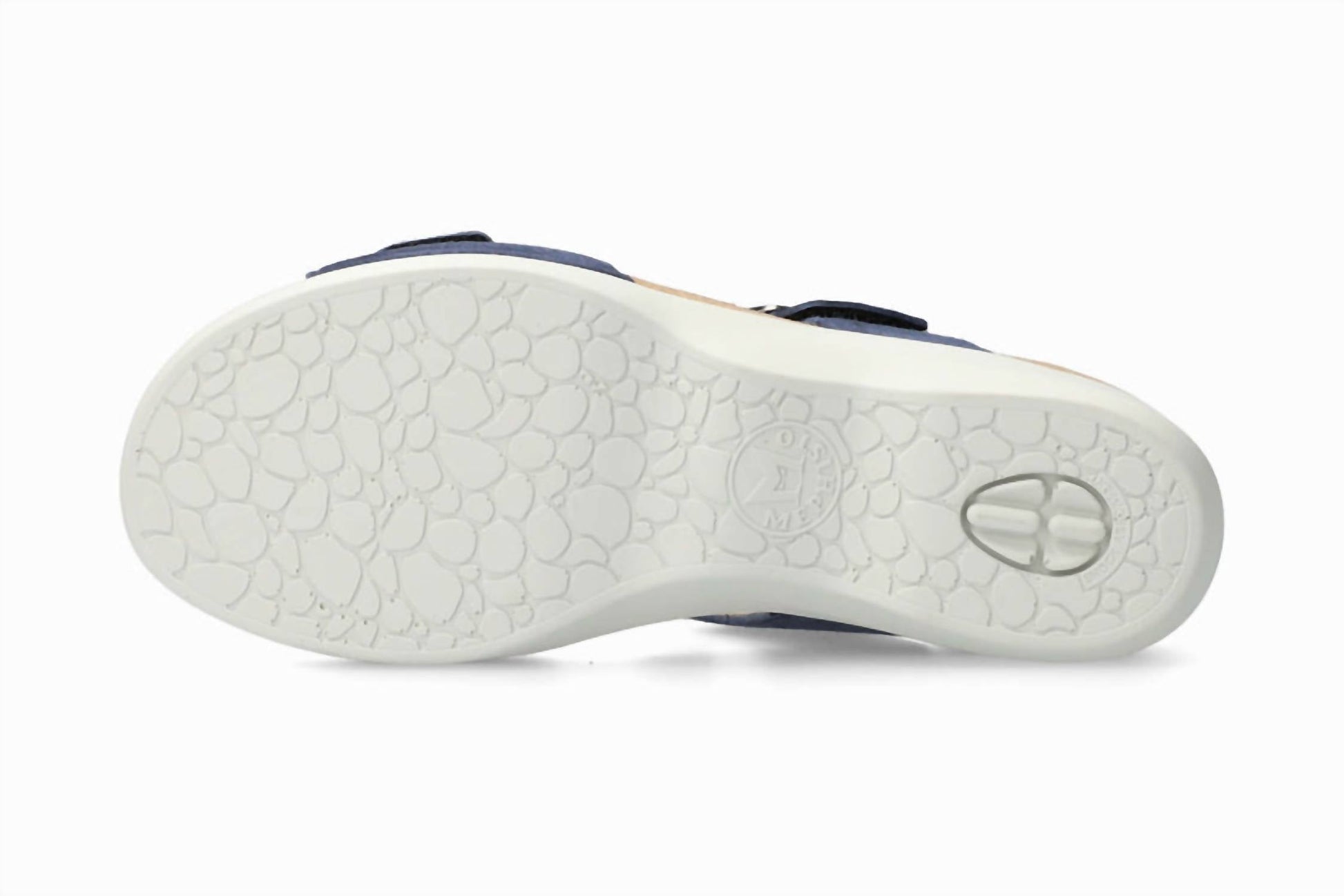 Introducing the Women's Oriana Wedge Sandals by MEPHISTO, an epitome of casual-chic style in a stunning Midnight Blue. These sandals are crafted from velvet leather with a leather lining and feature a comfortable wedge heel of 1.8 cm. They boast a durable hook and loop closure for easy wear and standard width for a snug fit. With a 100% premium cork footbed enhanced with AIR-RELAX technology, these sandals are designed to adapt to your foot's contours, providing exceptional support and comfort.