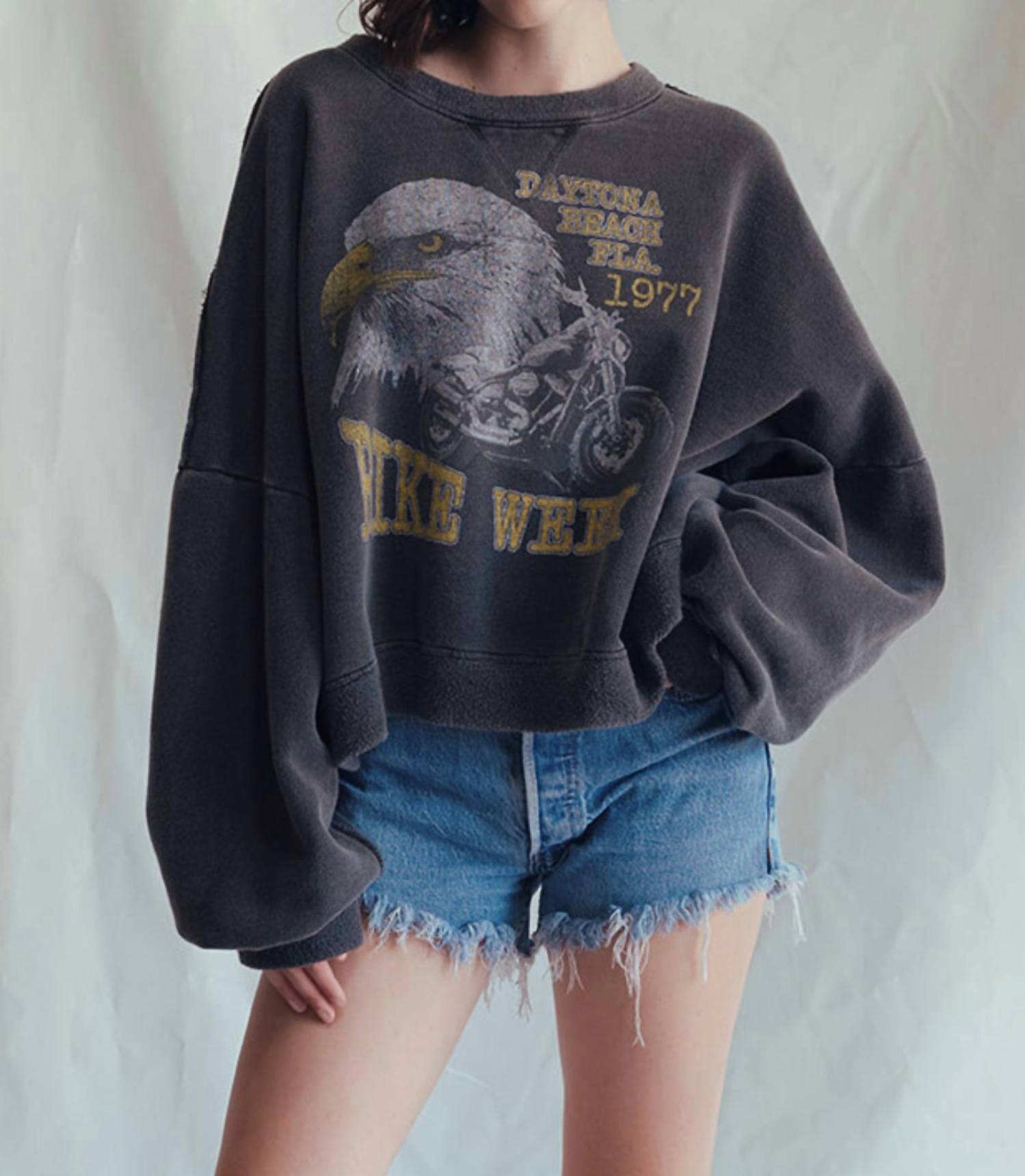 Experience the perfect blend of comfort and style with this trendy crew neck sweater, designed to effortlessly elevate your wardrobe. Pair it with your favorite denim and loafers for the perfect look. Elevate your travel wardrobe with the Daytona Sweatshirt by People of Leisure, a vintage-inspired piece in a chic vintage black hue that exudes bold American heritage. This graphic sweatshirt features long sleeves and a comfortable crewneck, perfect for the fall season and occasions like Thanksgiving. Crafted from 100% cotton, its pull-on design makes it effortlessly stylish and practical. Care is easy with machine washing in cold or warm water and low tumble drying; ensure to wash separately initially to preserve its unique dye variations.