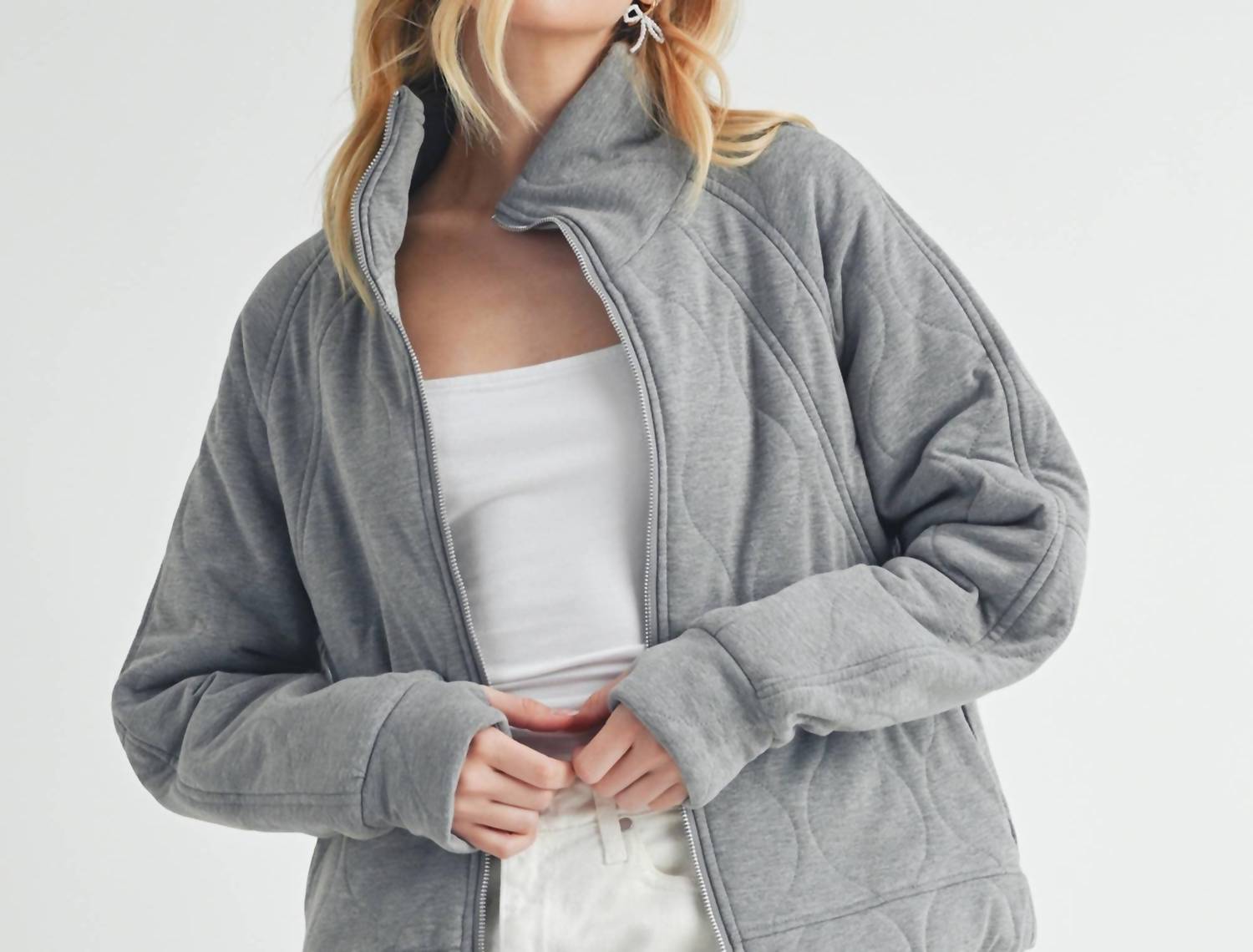 Stay warm with the Darla Quilted Jacket by AEMI + CO, a stylish essential in Heather Grey. This long sleeve jacket is crafted from 65% polyester, 30% cotton, and 5% spandex for a comfortable fit. It features a zipper closure and roomy pockets, offering a sleek and contemporary vibe. Perfect for layering, this jacket combines a relaxed, boxy silhouette with detailed quilting. Care instructions: Machine wash. Model is wearing a size small, fitting sizes 2-4.