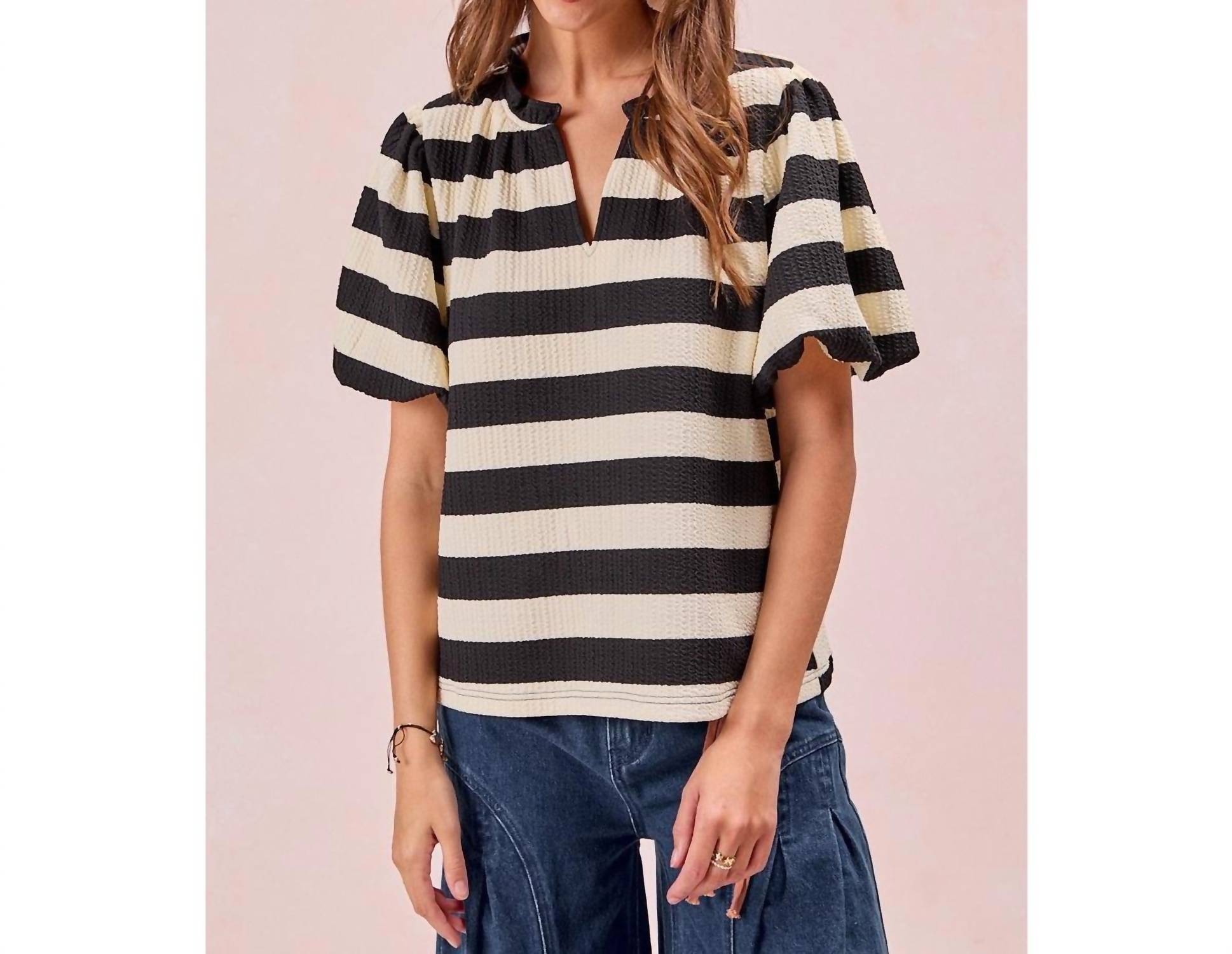 Introducing the BiBi Stripe Balloon Sleeve Ruffled V-neck Top, a chic addition to your spring wardrobe. Designed with short balloon sleeves and a romantic V-neckline with ruffle trim, this blouse offers a timeless stripe print in black and white. It features a relaxed fit in lightweight, breathable fabric, perfect for warmer days and versatile for travel occasions. Closure: Pull on. Pattern: Stripe.