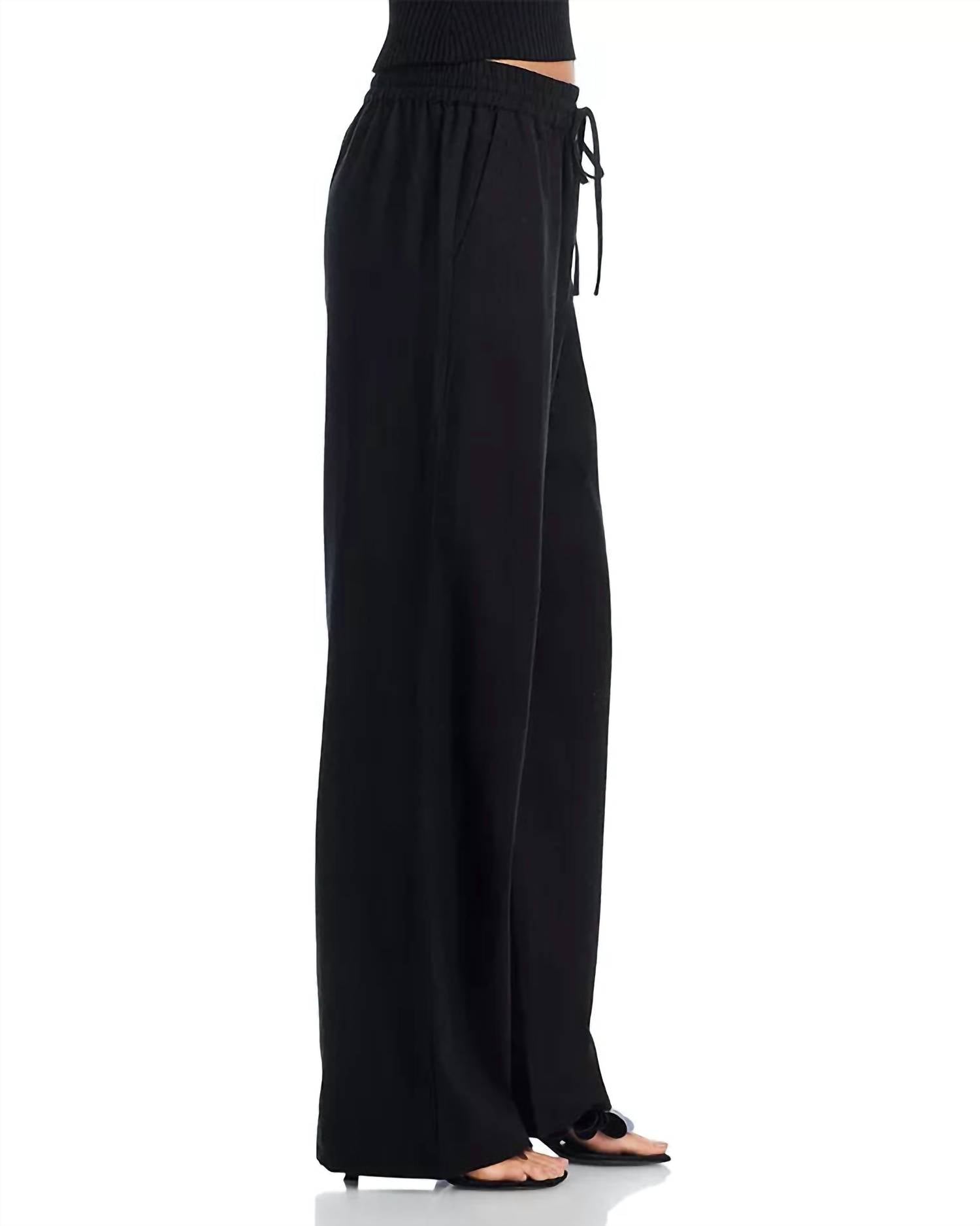 Introducing the Venetia Drawstring Pants by Steve Madden, the perfect choice for stylish summer vacations. Designed for women with a focus on comfort and elegance, these wide-leg pants come in a sleek black solid pattern. Made from a nylon blend featuring 92% rayon, 7% linen, and 1% other fiber, they offer a regular fit and a mid-rise waist. Easy to wear with a pull-on closure and equipped with pockets, these pants require hand washing and line drying for care.