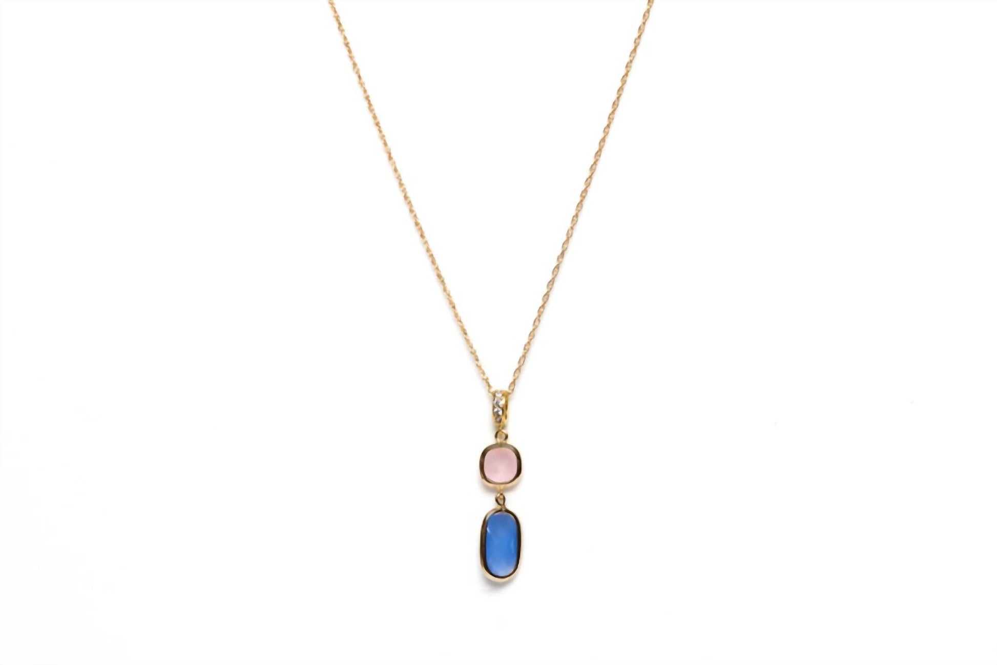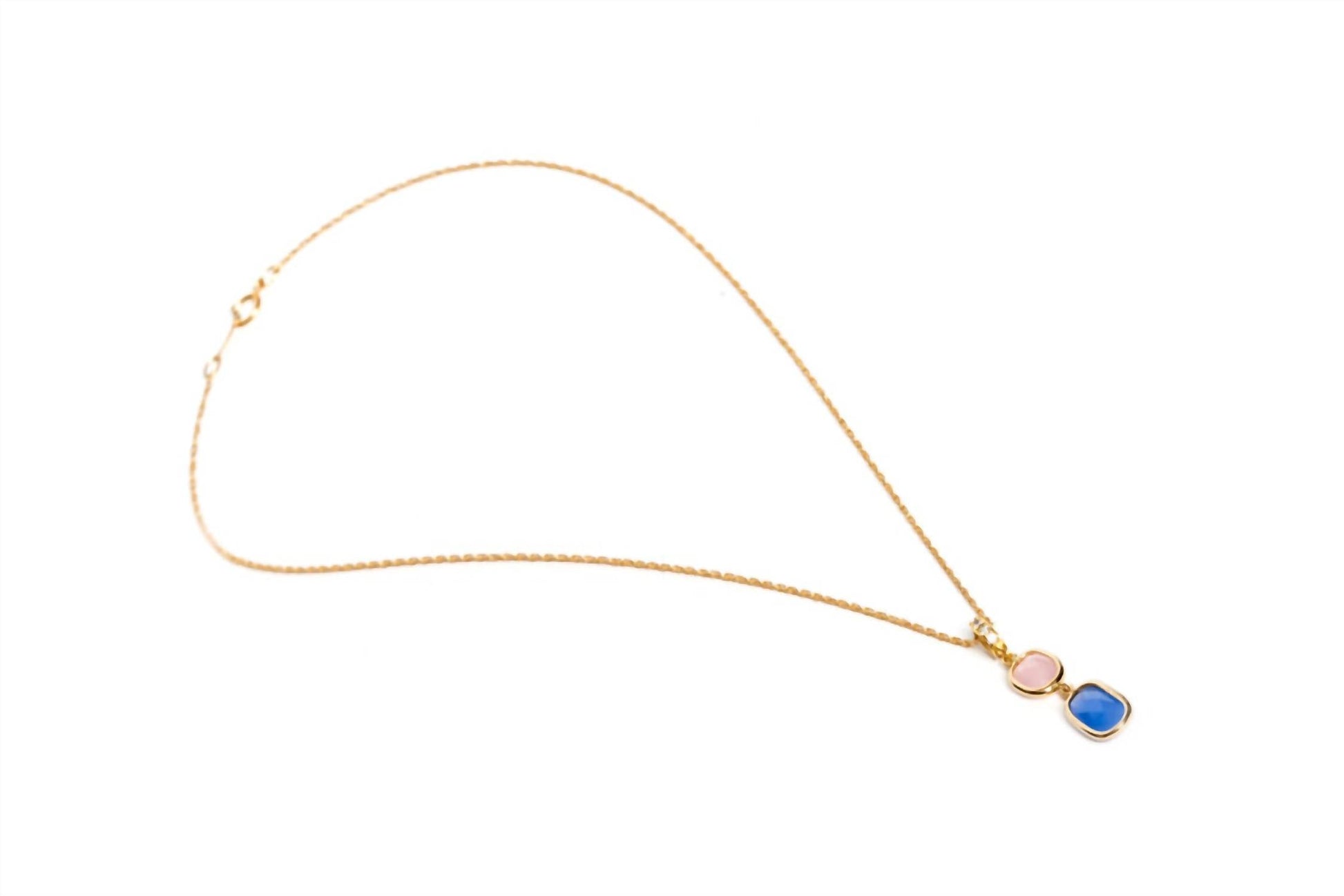Elegant addition to your jewelry collection. Handcrafted piece showcases a pink and purple pendant beautifully plated in gold, paired with a gold-filled chain. Measuring 18 inches in chain length with a 1.25-inch pendant, promises to delicately enhance any look. Complete your ensemble with matching earrings available separately.