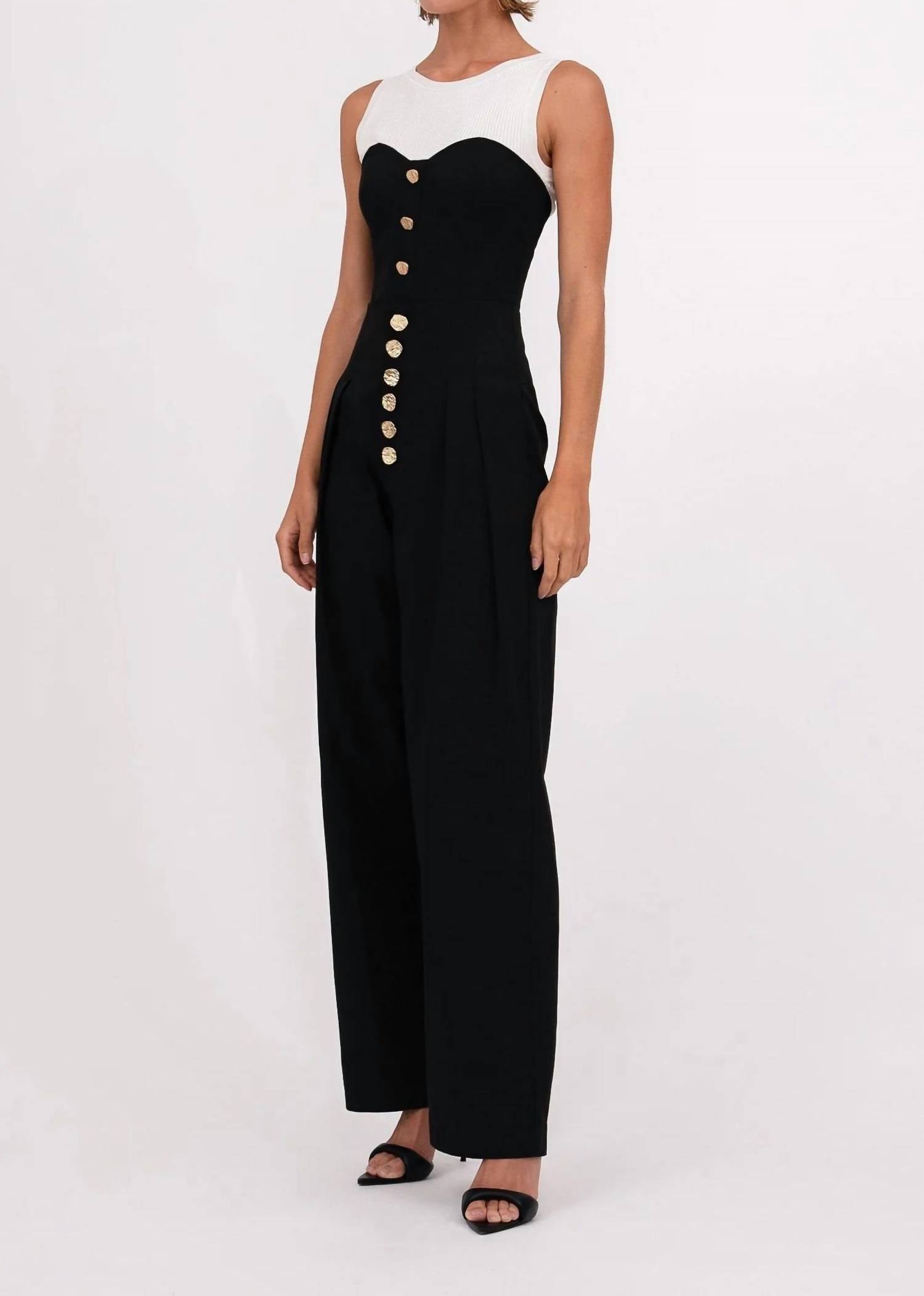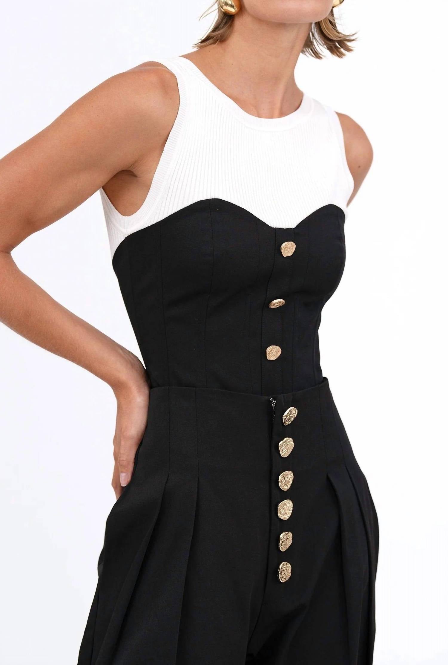 The Bowie Tank Top by Nonchalant Label is a sophisticated choice for any dinner party or New Year's Eve celebration. This sleeveless piece offers a distinct texture with a black and white pattern and features a ribbed knit crewneck for a flattering minimalist style. Made with careful attention to detail, it includes a zip closure down the center adorned with elegant gold buttons. For care, this top requires dry cleaning to maintain its pristine condition, and the model wears a size small (5'11" height).