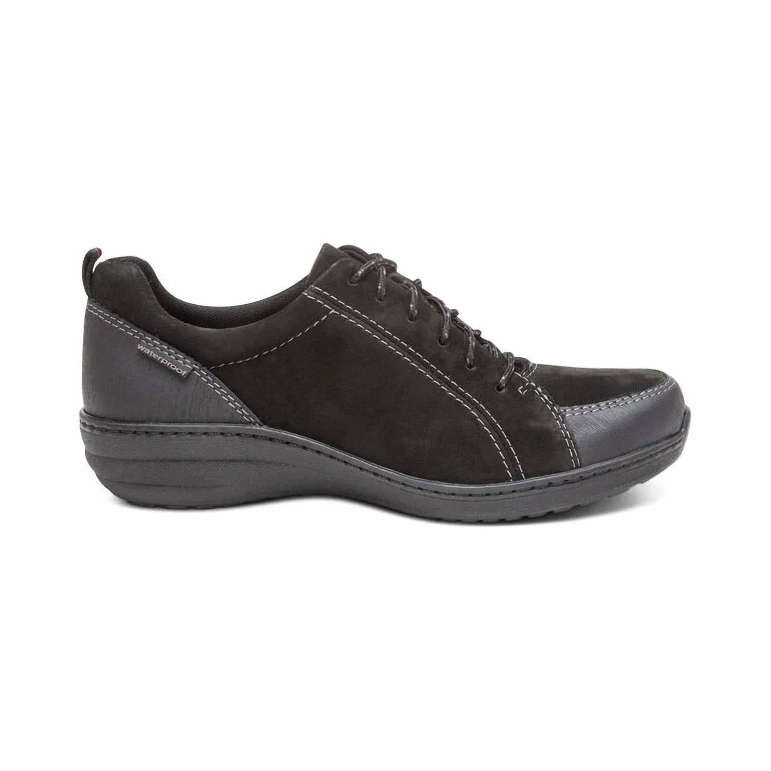 Cute, functional, and comfortable. These sneakers check all the boxes. Experience ultimate comfort with the Women's Mara Hiking Sneaker by Aetrex in sleek black, featuring a supportive round toe design ideal for spring hiking. Crafted with genuine leather uppers and a durable rubber outsole, this sneaker promises both style and traction. Enjoy the UltraSky cushioning and arch support, complemented by a slip-resistant outsole and waterproof materials for all-day wear. With a flat heel height of 1 1/8", the Mara offers padded tongue and collar, lace adjustability, and a removable insole for a customized fit.